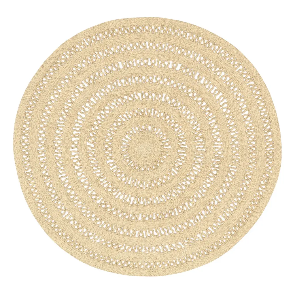 This 8' round rug is perfect for adding a rustic touch to any indoor space. Featuring a geometric medallion design in wheat color, it is crafted from 100% jute fiber for durability and a natural look.
