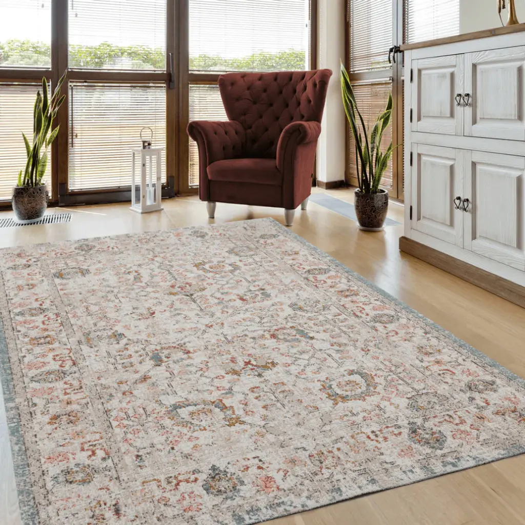 Set an inviting tone in your space with this 8'' x 10'' beige floral stain resistant indoor outdoor area rug. This rectangle shaped rug features a floral design in beige to give it visual interest. A classic shape marries with good looking design for your space The coloring of this rug adds a delightfully neutral tone to your home and will easily match with most any decor. This superior Turkish rug represents the highest quality and is built to last. Ideal for spaces with kids and pets, this rug is stain resistant to help repel stains and spilled liquids. Place this area rug against a hardwood or tile floor and it will enliven your living space with style and sophistication. 0.3" H x 117" W x 93" D