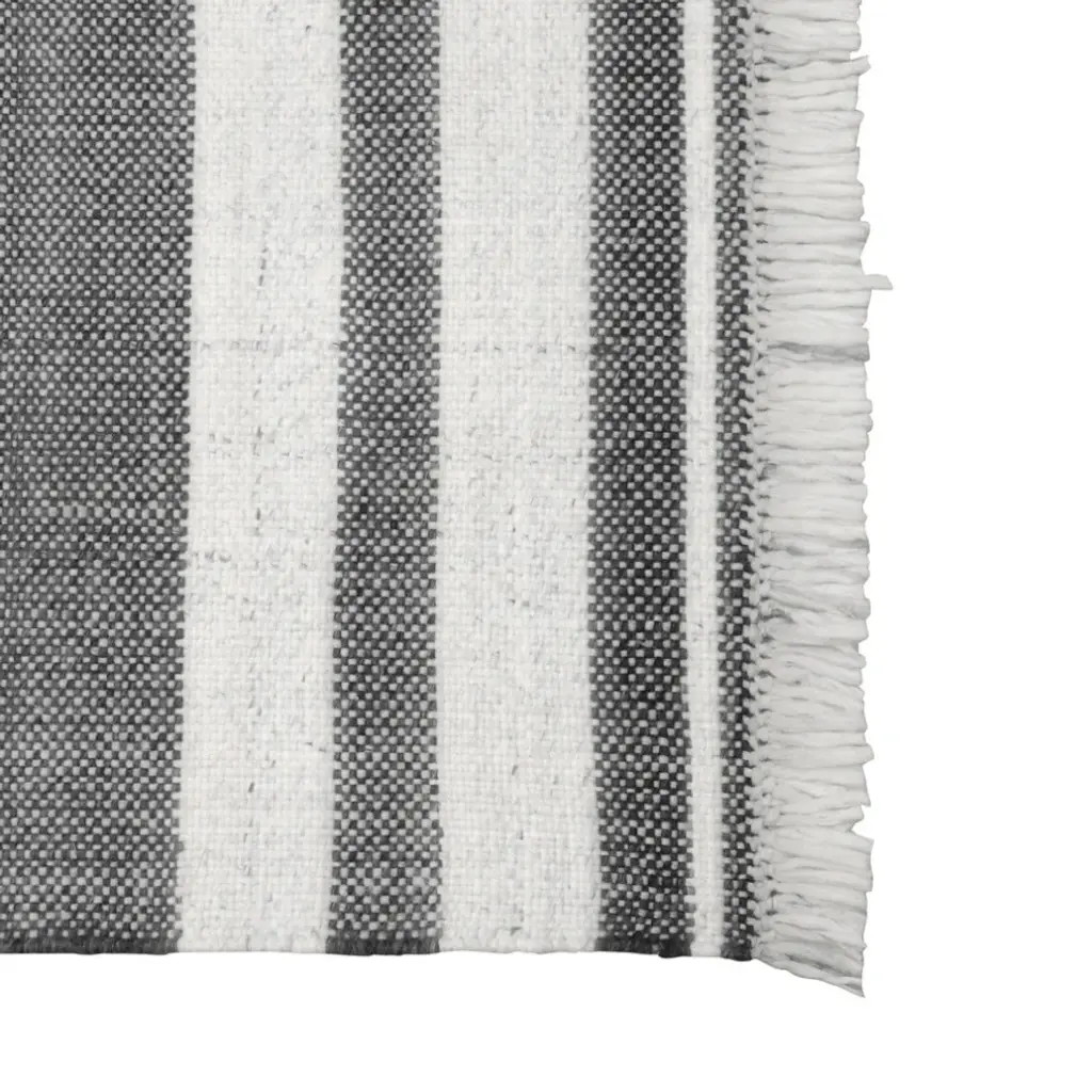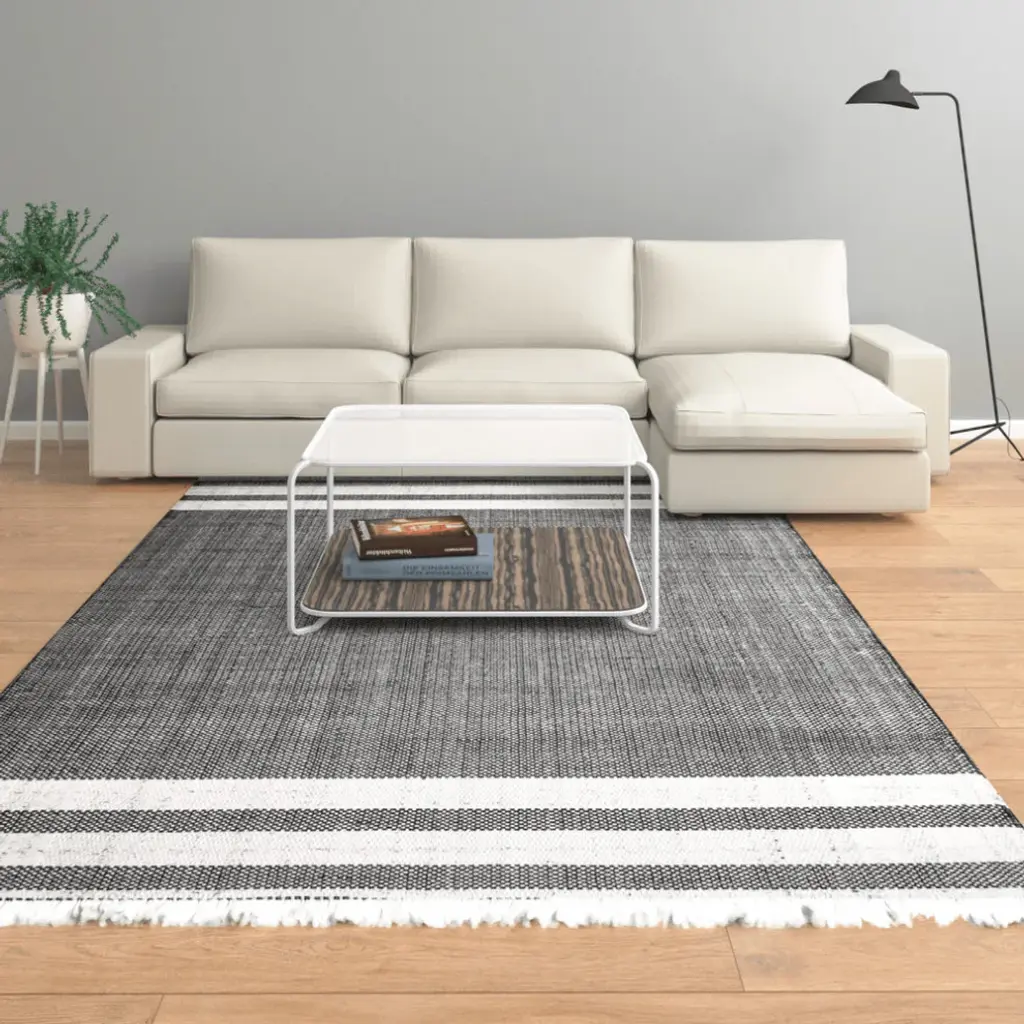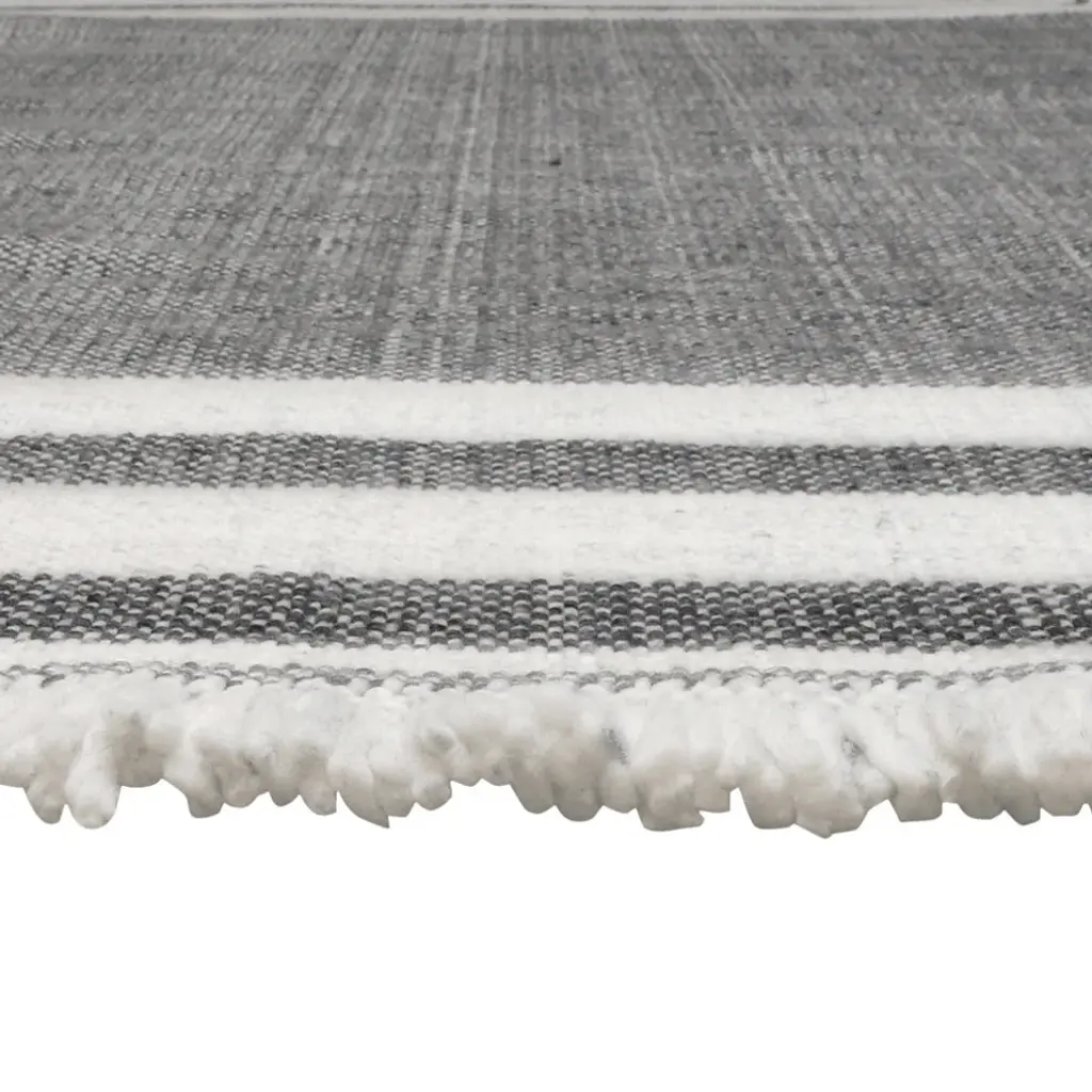 This 8-foot x 10-foot gray striped handmade stain resistant non skid indoor outdoor area rug, is a great way to add warmth to a room. This rectangle shaped rug features a striped design in dark gray to give it visual interest. A classic shape marries with good looking design for your space Ideal for spaces with kids and pets, this rug is stain resistant to help repel stains and spilled liquids. Area Rugs help to give warmth and sense of home to your space. 0.27-inch H x 117-inch W x 93-inch D