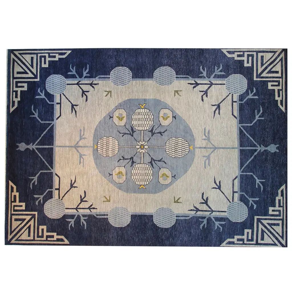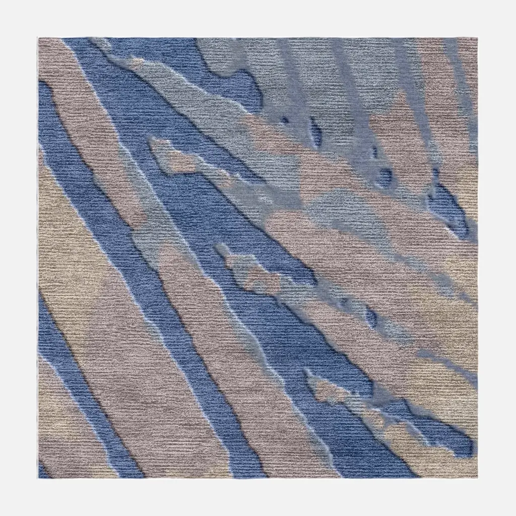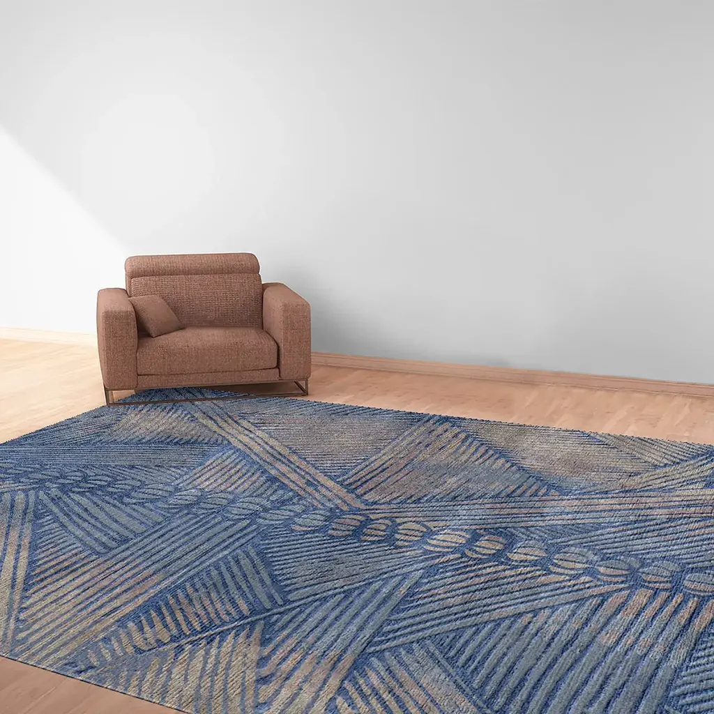 The Bamako Cornflower extra large area rug has a sharp, geometric print. It is hand knotted from Tibetan wool and bamboo silk with 80 knots per square inch. The abstract pattern of this extra large area rug looks as if it was drawn from an ink pen, giving it an understanded organic feel when paired with a carefully curated collection of modern furnishings. This home, office or restaurant flooring rug is available in multiple sizes. Custom sizes also available please send your inquiry on the contact form below.