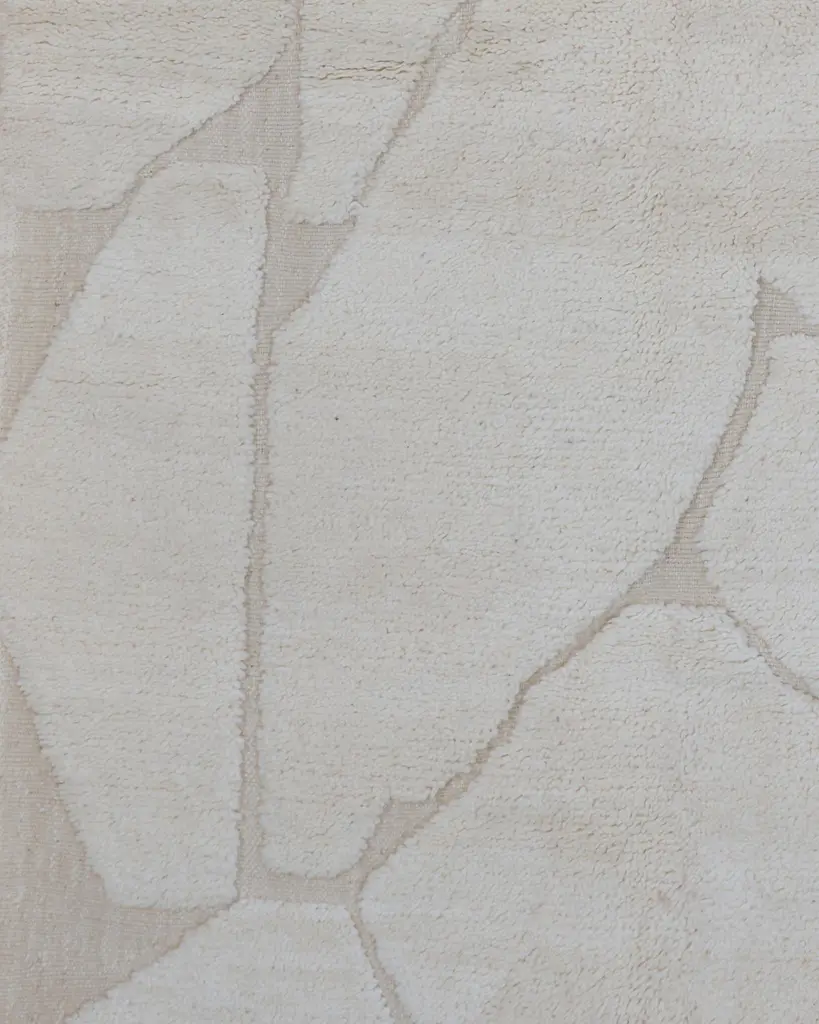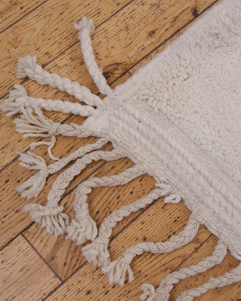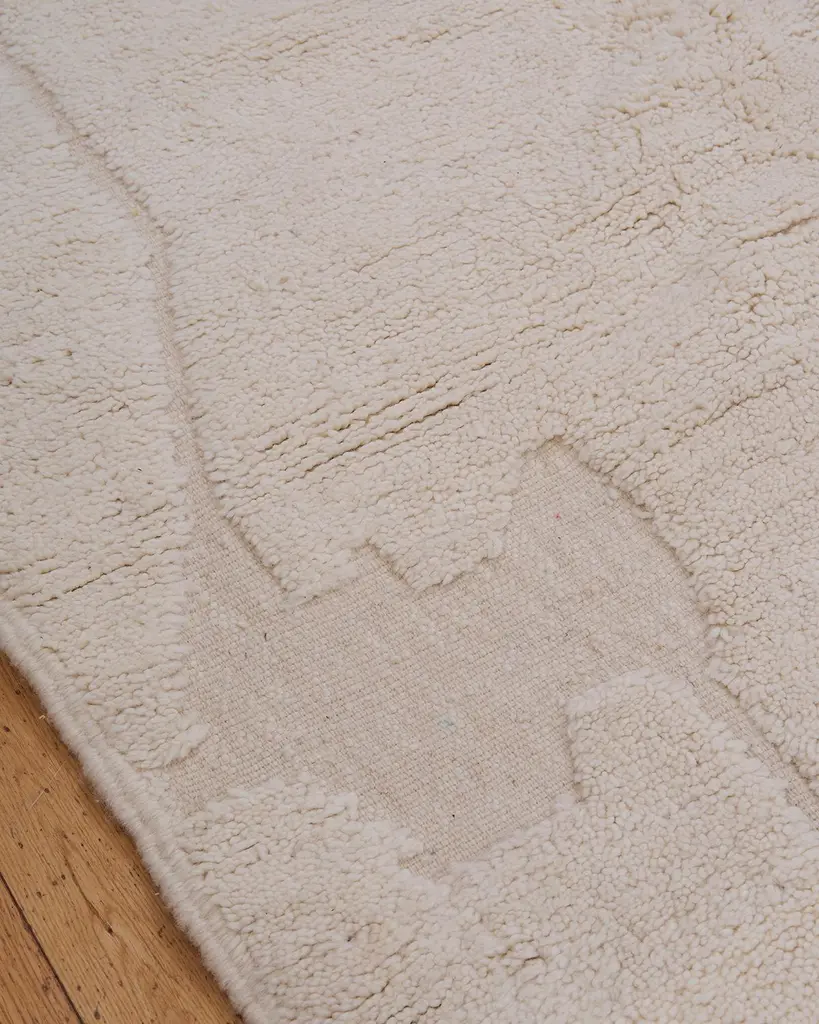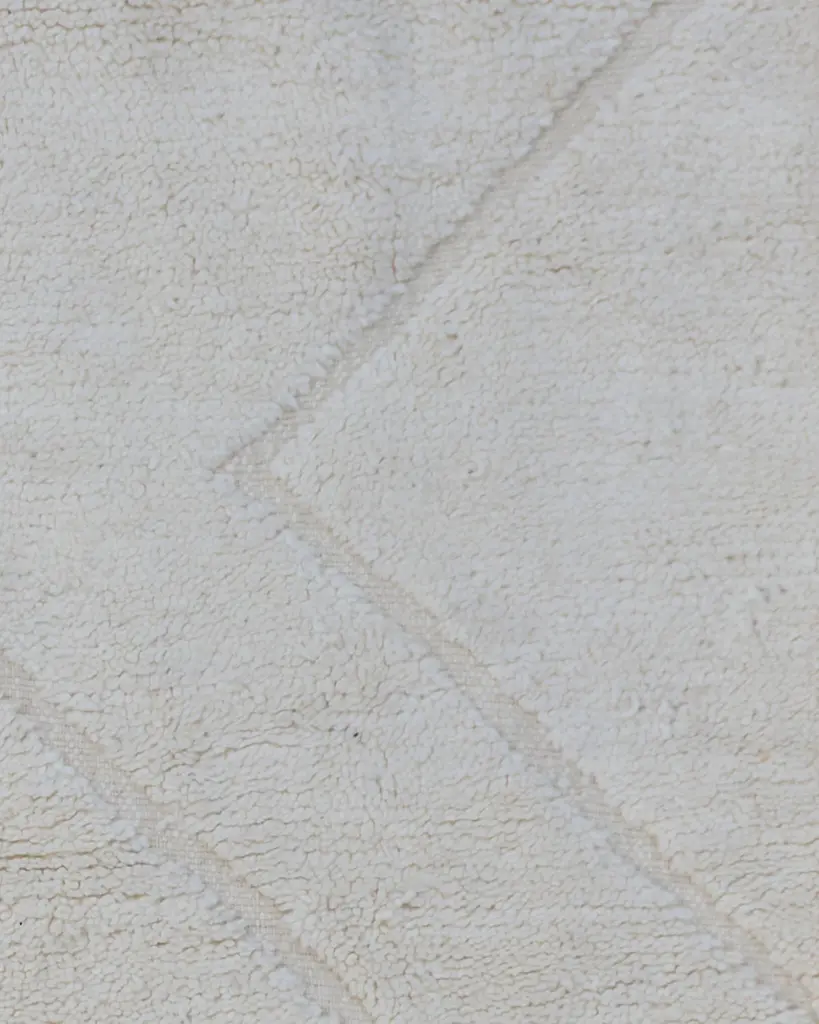 The Amina rug is a luxurious Beni Ouarain piece, handcrafted by skilled Berber artisans in the Atlas Mountains of Morocco. Made from 100% natural sheep's wool, this rug features a thick, plush pile that offers both warmth and texture to any room. Its minimalist geometric design, rendered in contrasting shapes on a soft cream/ivory background, adds a refined touch to your home, blending seamlessly with a range of interior styles.Dimensions:L: 11'4" (136")W: 8'4 1/2" (100 1/2")Estimated Weight: 65 lbsShipping Dimensions: 12” H x 12” W x 108” L (rolled)Material: 100% sheep's woolCare: Vacuum regularly, avoiding abrasive brushes. Spot clean spills immediately. Do not dry clean; for deep cleaning, consult a professional.Beni Ouarain rugs are celebrated for their exceptional craftsmanship and durability. The Amina rug, with its thick wool pile and timeless design, is an enduring addition to any space, offering both style and comfort.