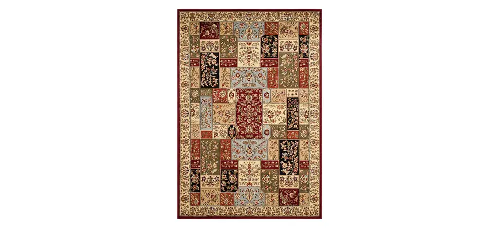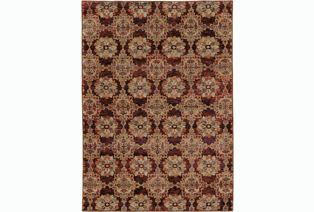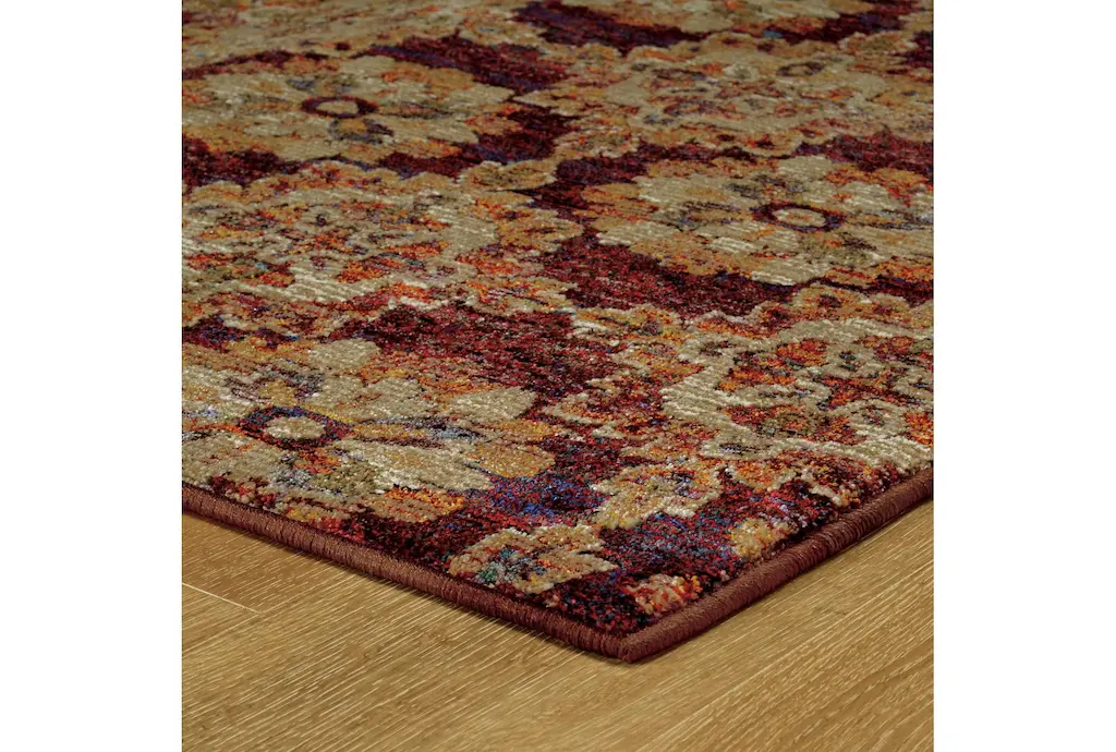 Add a touch of sophistication to your living space with the 8'5"x11'6" Fiber Rug-Safaa Tile Traditional Botanical Red Rectangle Indoor rug. This beautiful rug features a traditional floral motif in rich red and gold hues, perfect for enhancing the warmth and style of any room. Made in the USA, it combines durability and comfort with its nylon and polypropylene blend.