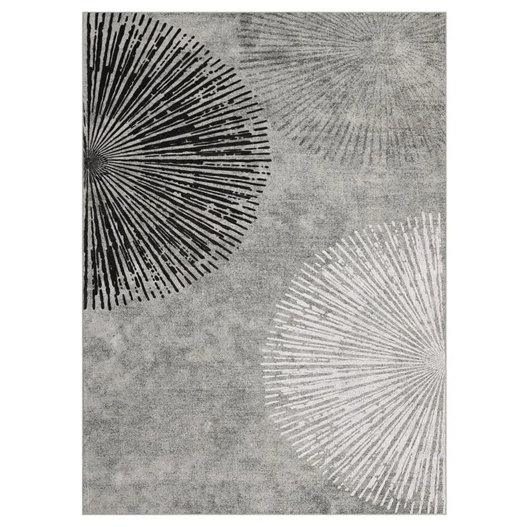 Feature: --Modern design elegance: Light-colored background with dynamic half-circle patterns resembling fireworks, adding energy and sophistication.--Non-slip safety: Equipped with anti-slip TPR backing to prevent sliding and protect floors from scratches, ideal for high-traffic areas.--Soft faux wool: Made from premium, skin-friendly polyester fiber, providing a cozy, non-shedding surface safe for kids and pets.--Easy to clean: Machine washable for effortless cleaning; daily care requires only a broom or vacuum, maintaining a fresh look for busy households.--Low pile design: Resists dust and dirt accumulation, with a smooth surface that prevents snagging, suitable for placement under furniture and in doorways.--Built for last: A tightly woven, machine-made structure. Sturdy edges prevent fraying. No fading of color. Specification:Size: 5x7 / 8x10 / 9x12 ftColor: grey / beigeMaterial: polyester fibre+textured TPRApplication: living room/bedroom/dining room/kids room/playroom/office/kitchen/farmhouse/floor/laundry Notes:Area rug may have temporary creases after you receive it. Please give it some time to flatten itself. Care instructions:Can be hand washed or machine washed in cold water.Use mild detergent.Support vacuum cleaner and robot vacuum. Packing list:Area rug x1
