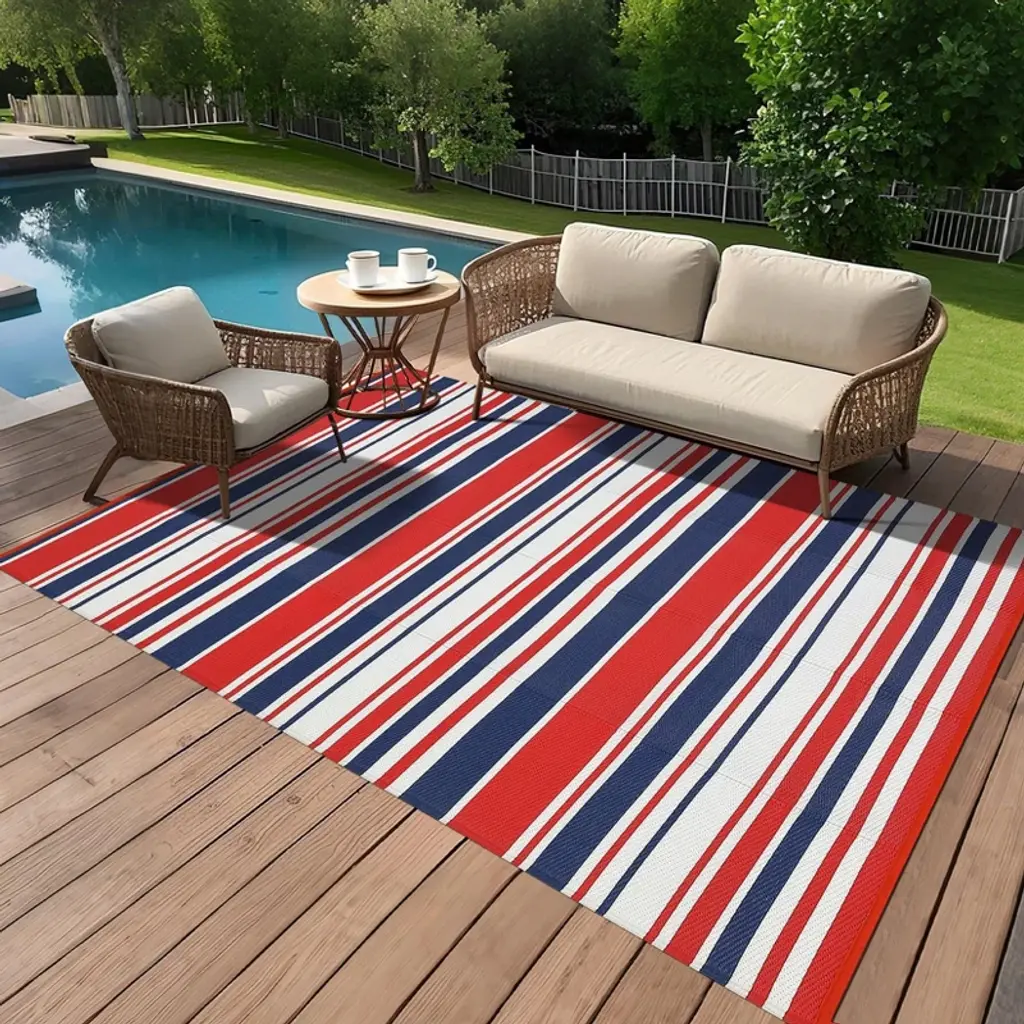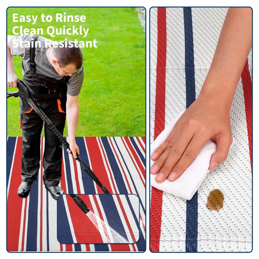 【Perfect Outdoor RV Camping Rug】: Woven from lightweight plastic straws, these outdoor rugs can be easily folded down to a compact size to fit in our included carry bag. This portable waterproof outdoor rug allows you to take it outside easily, and also designed 4 corner loops with 4 stakes to help fix the carpet in place. Using this camper rug will relieve all the burden and fatigue of your RV trips and camping, allowing you to have plenty of imaginable space for more fun 【Reversible & Versatile】: Featuring a modern geometric pattern on both sides, this indoor outdoor rug is designed for versatility. Simply flip it over for an instant style refresh. Perfect for patios, porches, RV campsites, and more, this camping rug adapts effortlessly to any setting 【Stain-Resistant & Easy Cleanup】: Crafted with tightly woven plastic straws, this outdoor carpet for patio allows liquids to drain through while keeping solids on top for easy rinsing. Stains wash away quickly, ensuring fast, hassle-free cleanup that’s perfect for outdoor use 【UV-Resistant & Built to Last】: With a UV-protective coating, this outdoor patio rug resists color fading, maintaining its vibrant look for years. Reinforced edges provide exceptional durability, making it ideal for frequent use in all weather conditions, whether at home or on the go 【Gentle Underfoot】: The woven plastic straw construction offers a soft, comfortable surface, perfect for barefoot lounging. Transform your outdoor space into a cozy retreat with this patio rug, designed for better relaxation 【Lightweight & Portable】: These foldable, lightweight outdoor rugs are incredibly easy to transport. Take them to picnics, lawn parties, or camping trips without hassle, ensuring comfort and style wherever you go