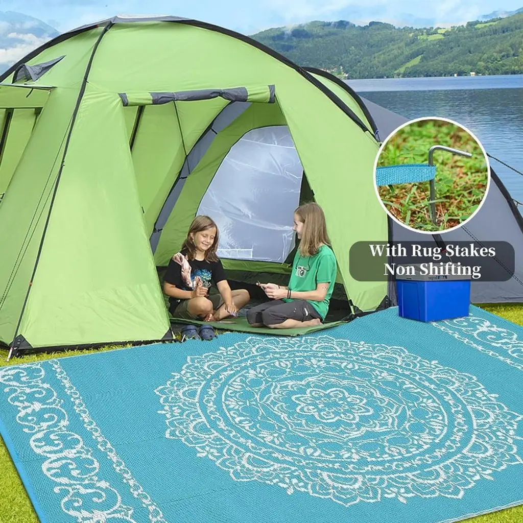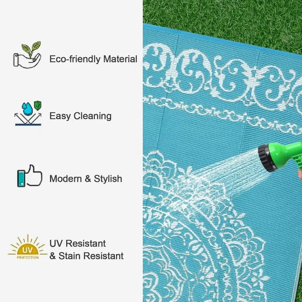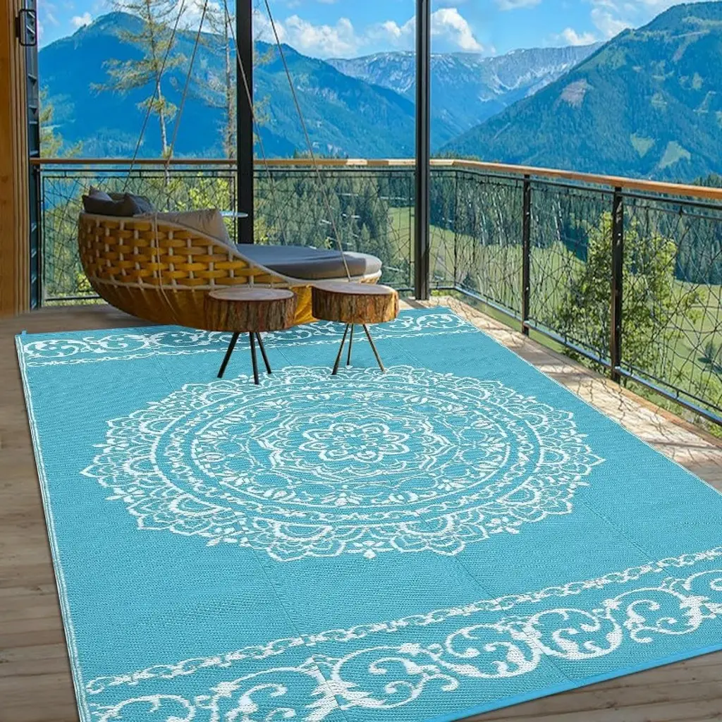 Coolmee 8x10FT Outdoor Rug Boho Waterproof Plastic Straw Area Rug for Patios Indoor Outdoor Reversible RV Mat for Picnic Beach Balcony, Light Blue White