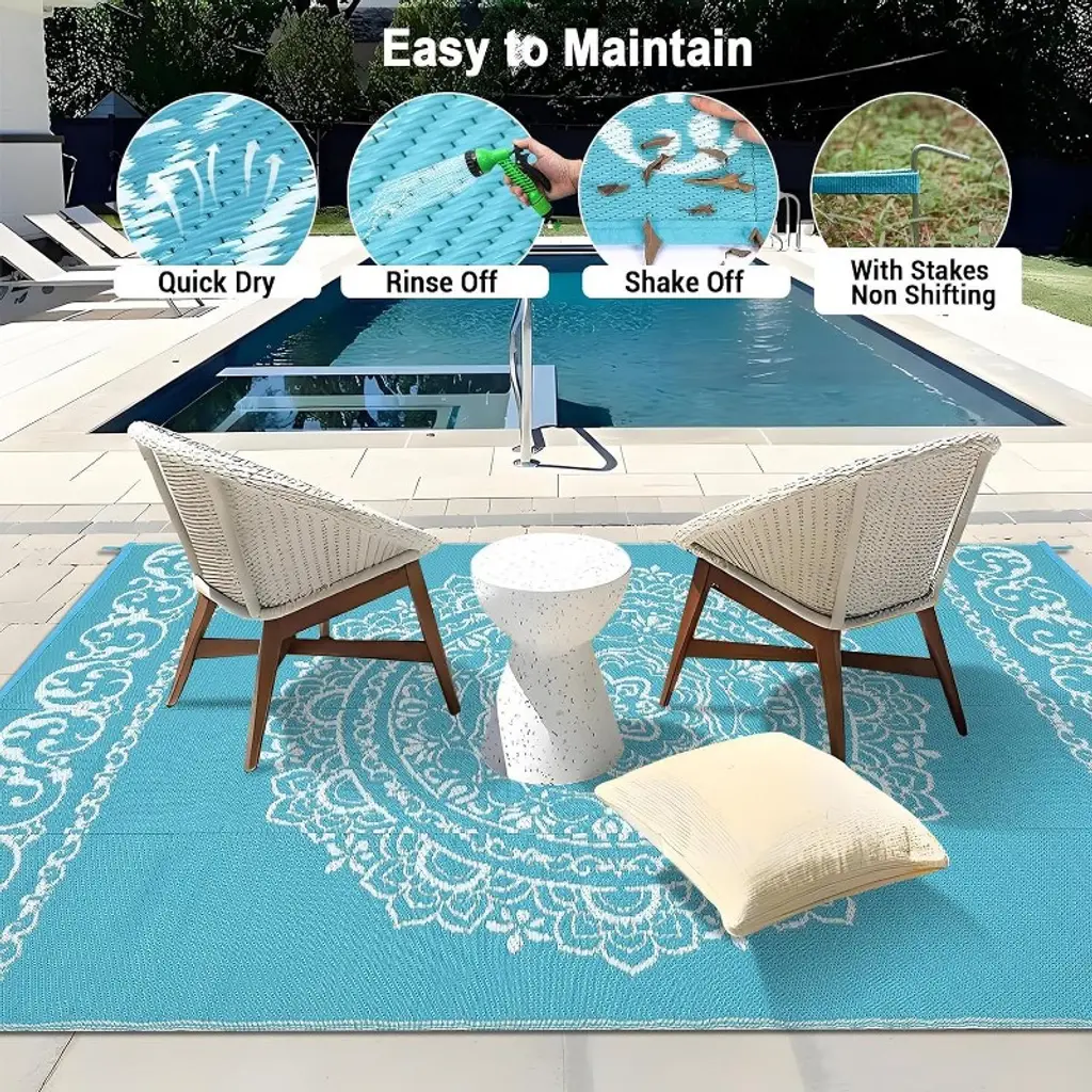 8X10ft Outdoor Rug Boho Waterproof Plastic Straw Area Rug For Patios Indoor Outdoor Reversible Rv Mat For Picnic Beach Balcony, Light Blue White