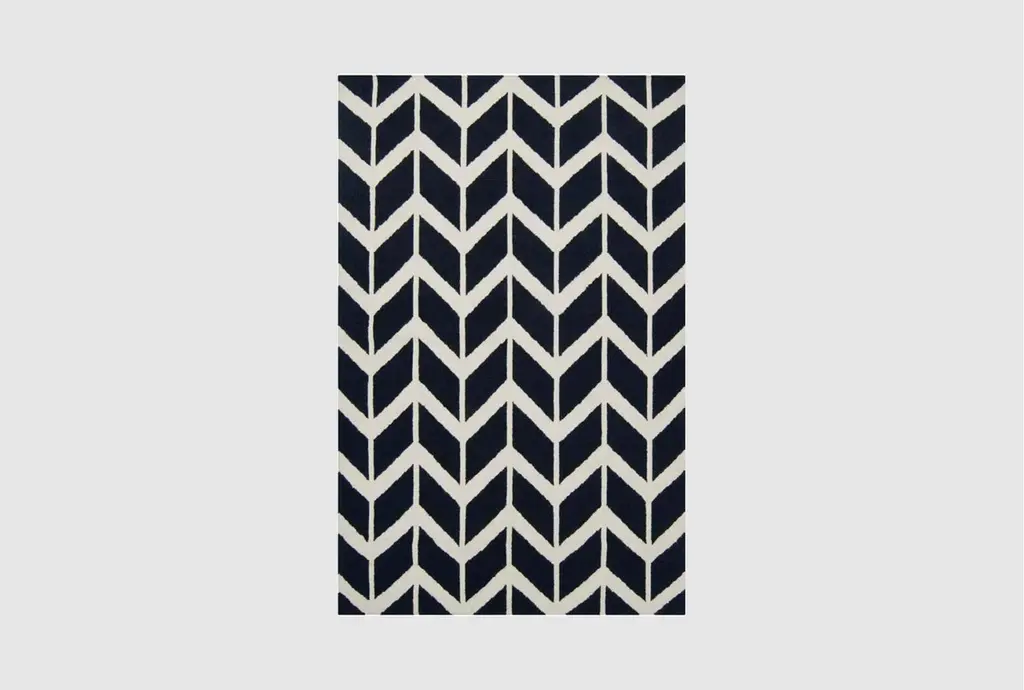 The Azibo blue chevron rug is flat woven by hand from 100% wool for a sinfully soft, extremely durable and low profile build that enables it to be placed in rooms with door clearance issues. A timeless navy blue and cream chevron pattern is intersected by abstract stripes, creating a look that can read as both modern and classic. Thanks to its full wool construction, this rectangular area rug is sturdy enough to be placed in rooms with the high foot traffic like entryways, hallways, living rooms and dining rooms.