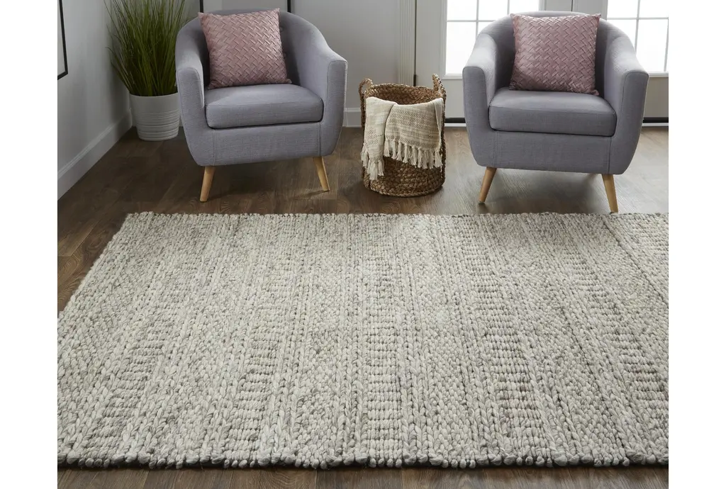 This beautiful 8'x11' rug is made of textured wool in a soothing oatmeal color with subtle stripes, adding a touch of casual elegance to any room. Handwoven and designed for indoor use, this low pile rug is crafted from high-quality fiber, ensuring both durability and comfort.