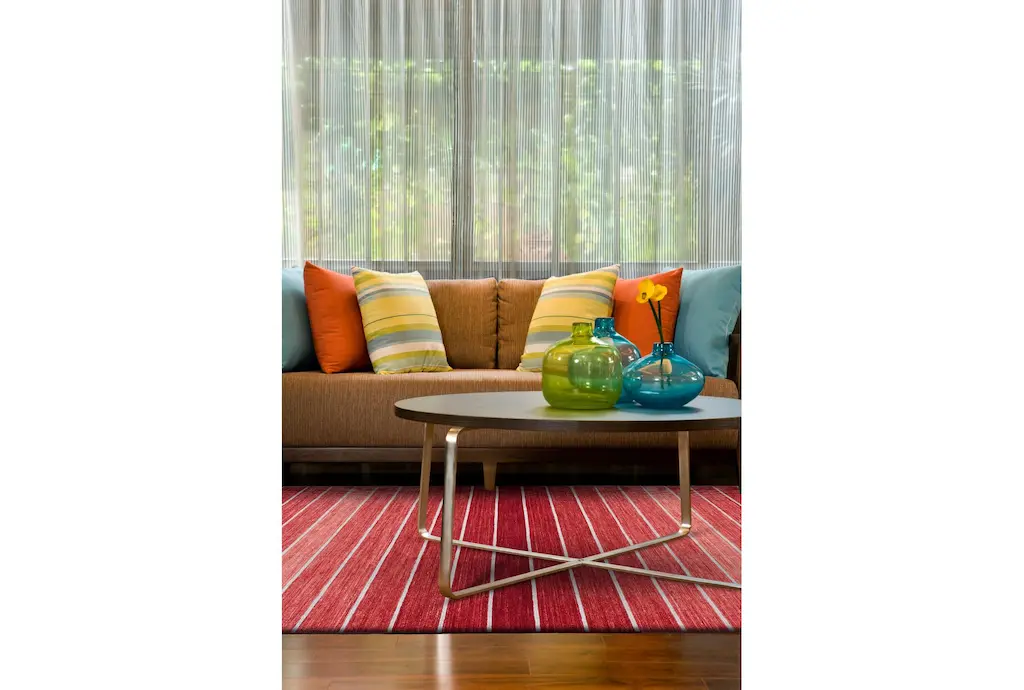 This beautiful 8'x11' rug features a stunning red ombre stripe flat weave design, perfect for adding a touch of contemporary style to any bedroom. With a low pile and made from high-quality fiber materials, this rug is the perfect addition to any indoor space.