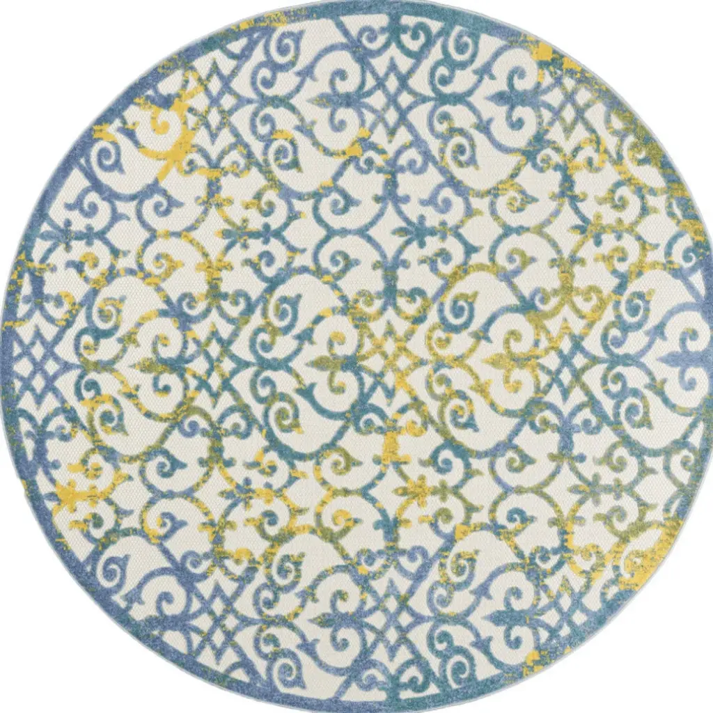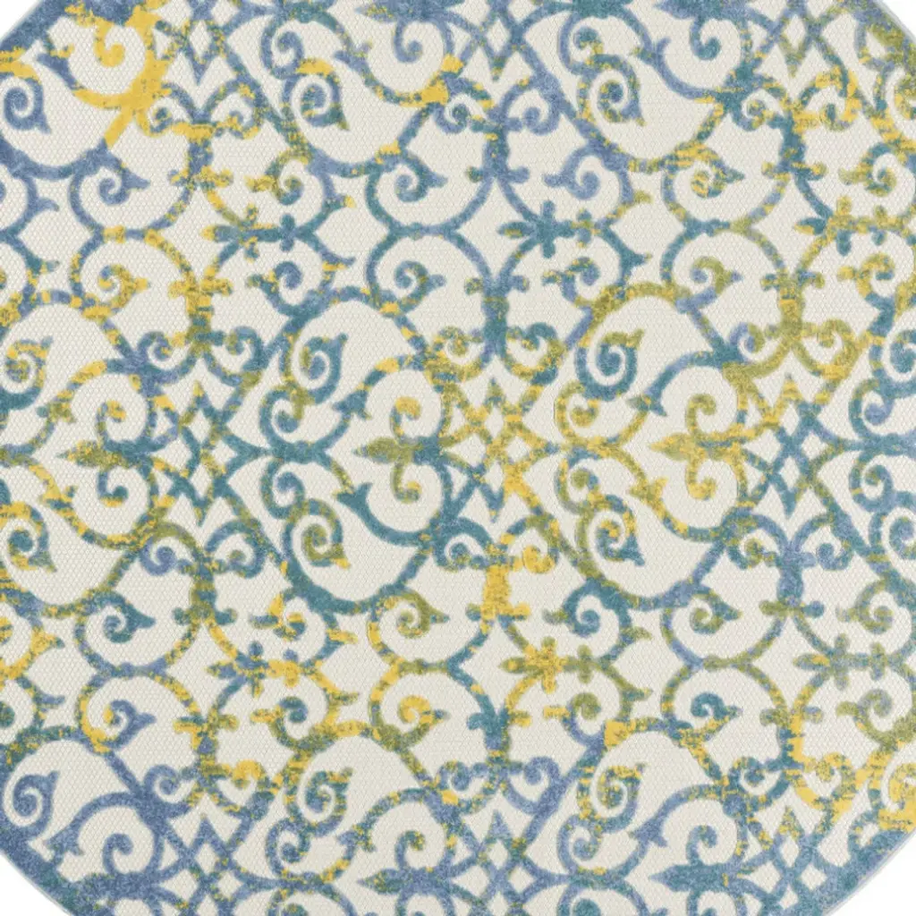 8'x8' Ivory And Blue Round Damask Non Skid Indoor Outdoor Area Rug