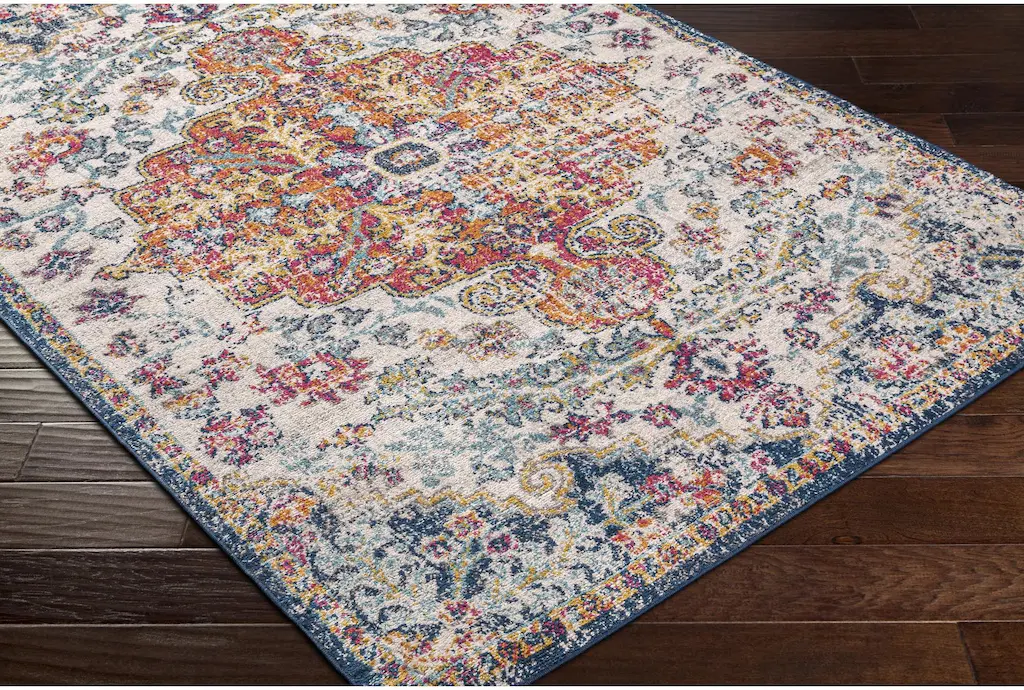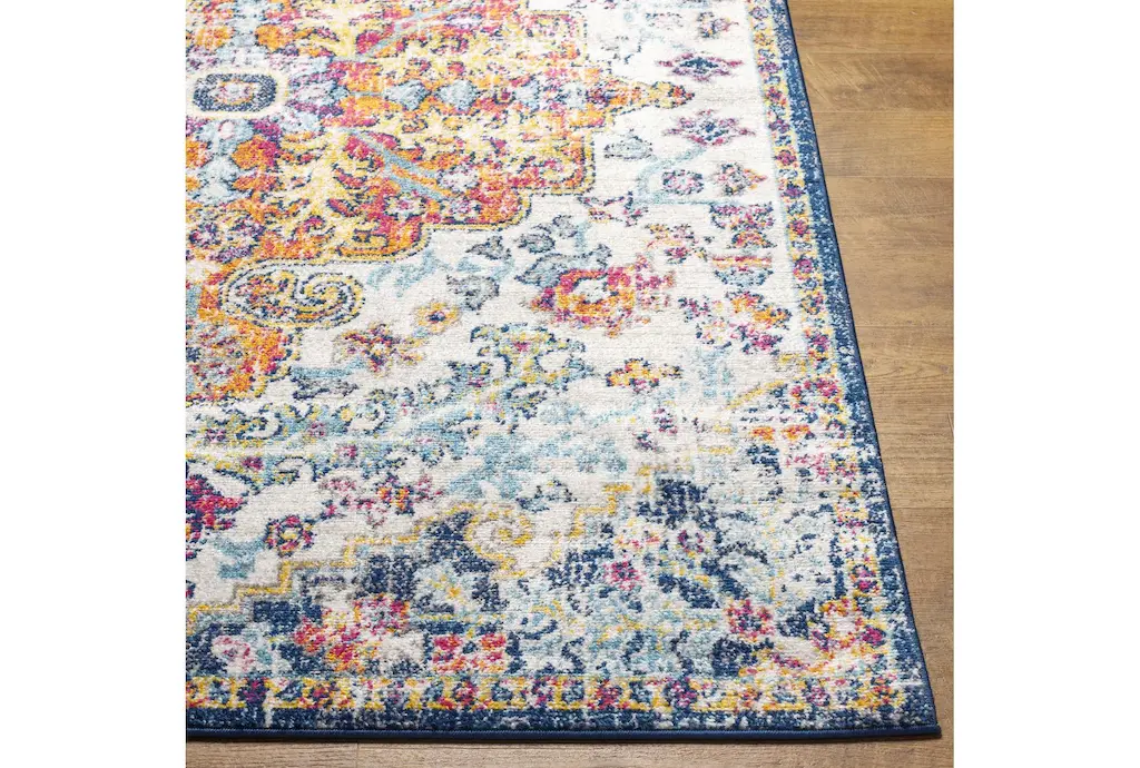 Enhance your living space with the 9'2"x12'5" Fiber Rug - Ivete Medallion Traditional Botanical by Surya. This beautiful low pile rug features a stunning medallion and botanical design in a vibrant mix of light grey, black, teal, dark blue, saffron, garnet, burnt orange, and beige. Perfect for dining rooms, indoor living areas, and more, this rug brings a touch of warmth and color to any interior.