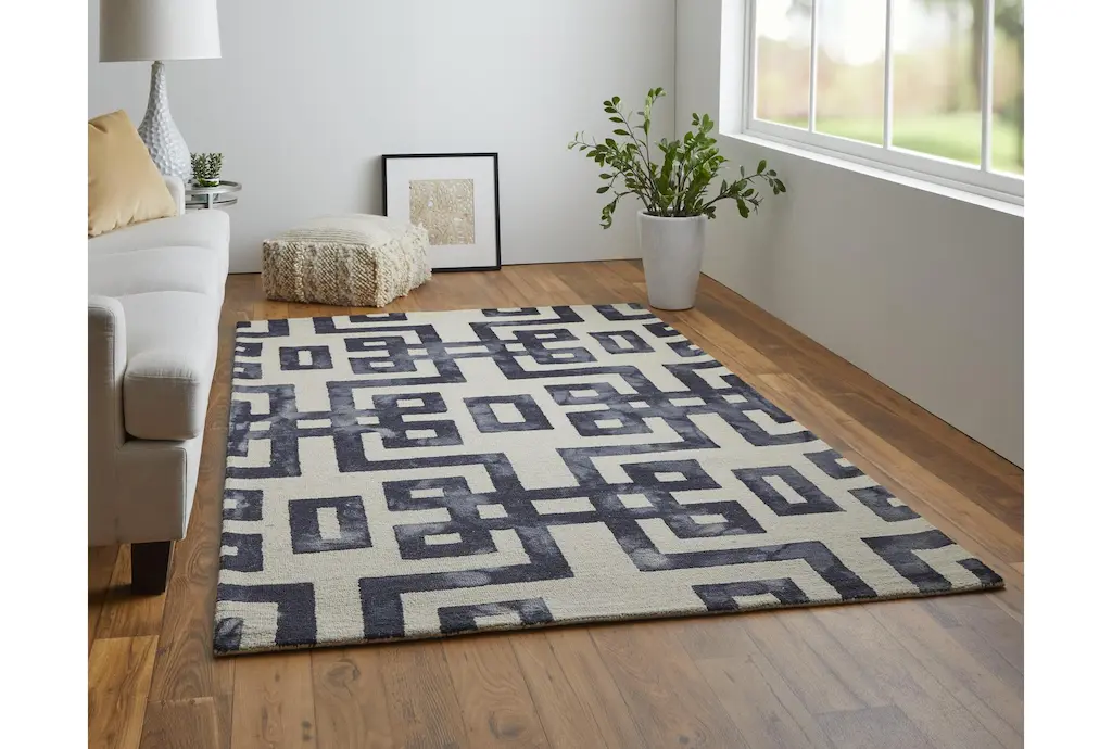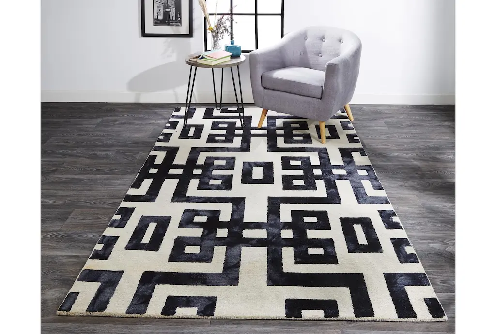 Bring contemporary style to your indoor living space with the 9'5"x13'5" Fiber Rug-Tristen Charcoal. This geometric rectangle rug features a striking noir color palette, adding a touch of sophistication to any room. Made with wool, it offers both durability and comfort underfoot.
