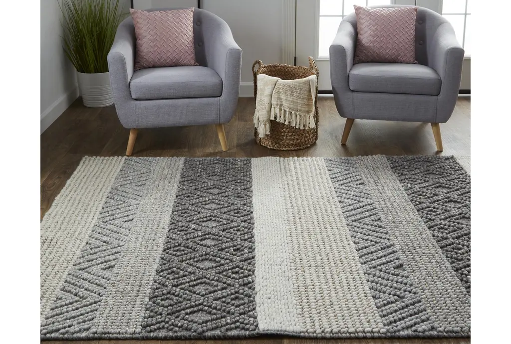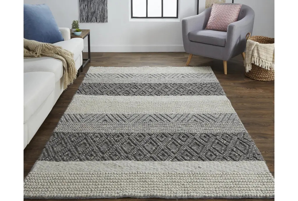 This 9'5"x13'5" rectangle rug brings a touch of casual charm to your living space with its textured wool stripe design in grey and sand hues. Perfect for indoor use, this geometric area rug complements rustic, country, and rural decor styles effortlessly.