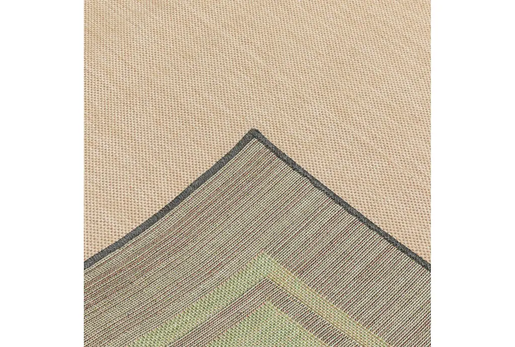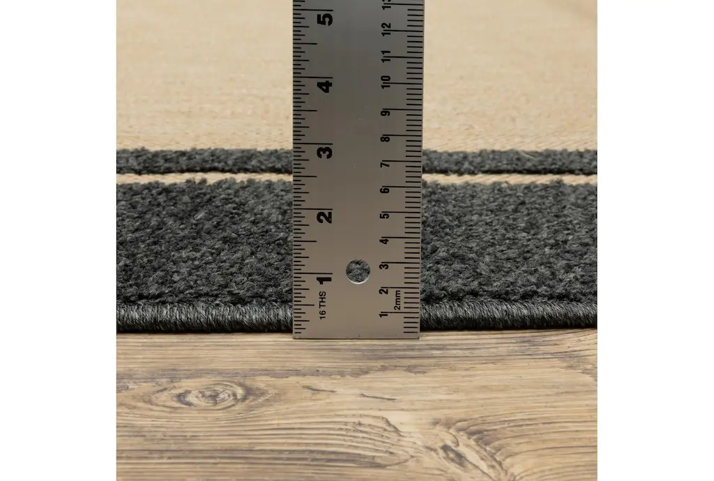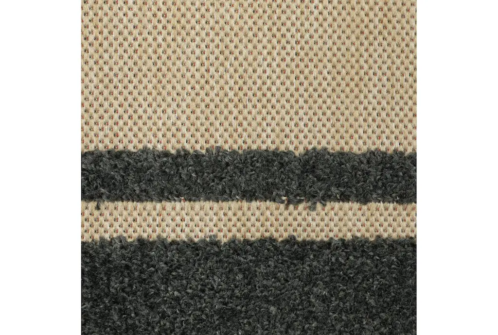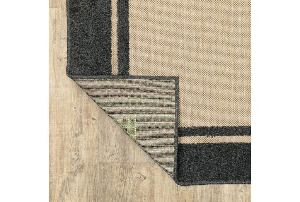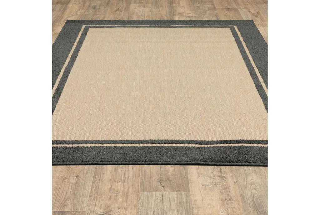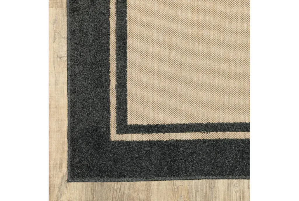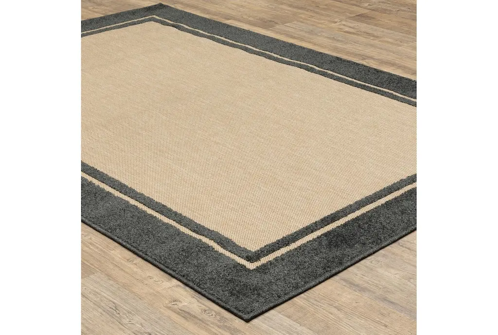 Enhance your living space with the 9'8"X12'8" Fiber Indoor/Outdoor Rug in Black Double Border. This contemporary rectangle rug features a sophisticated sand and charcoal color scheme, perfect for both indoor and outdoor settings.