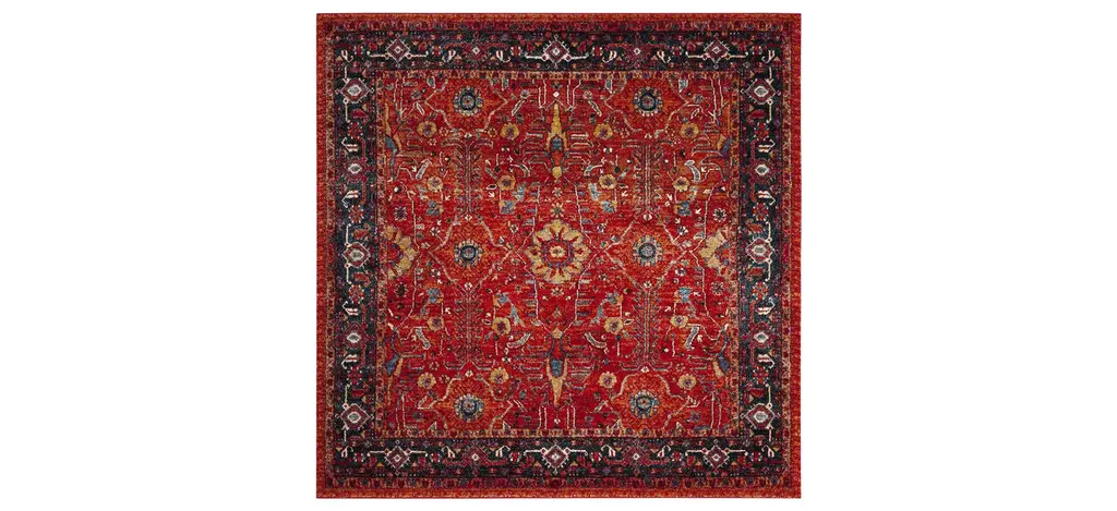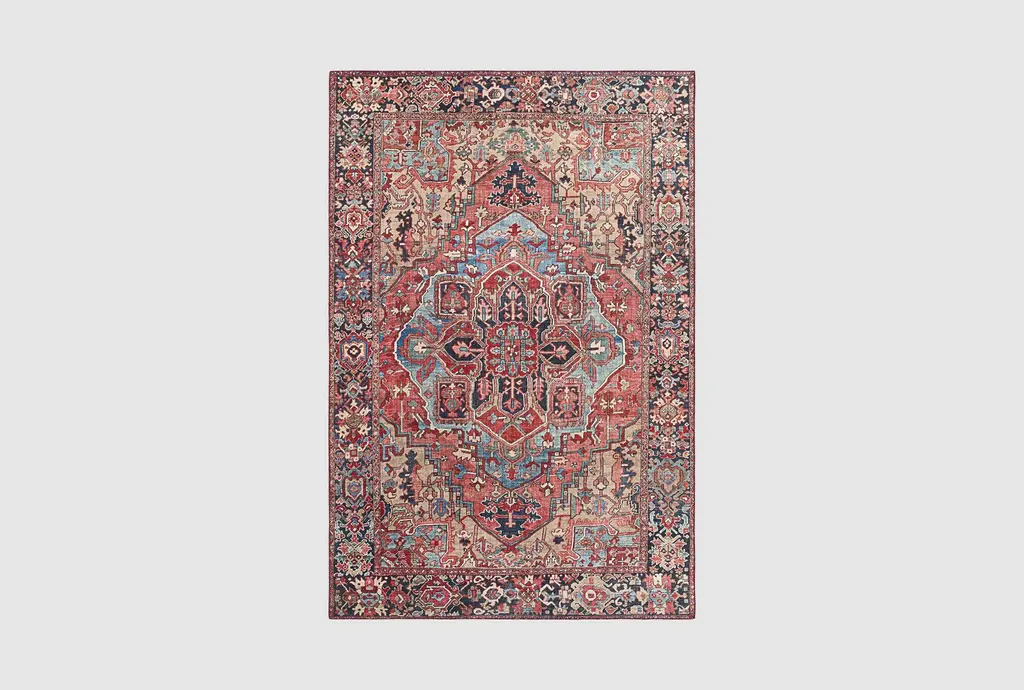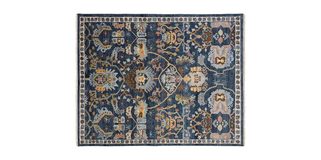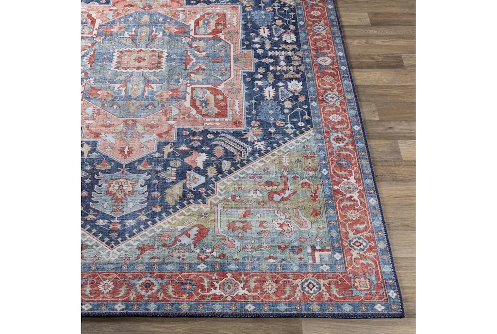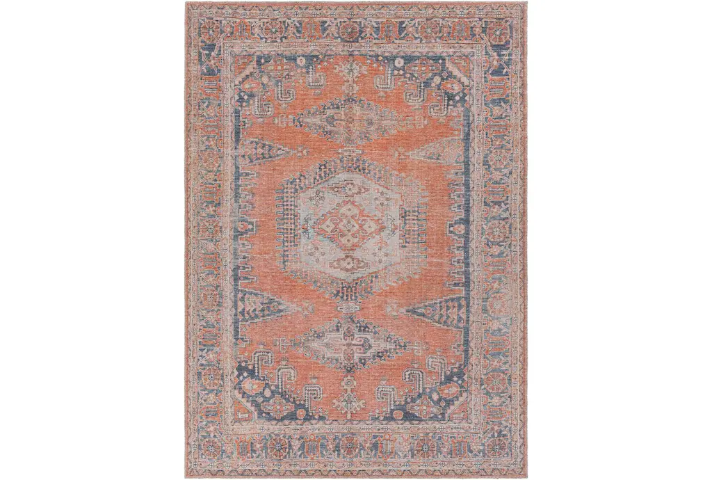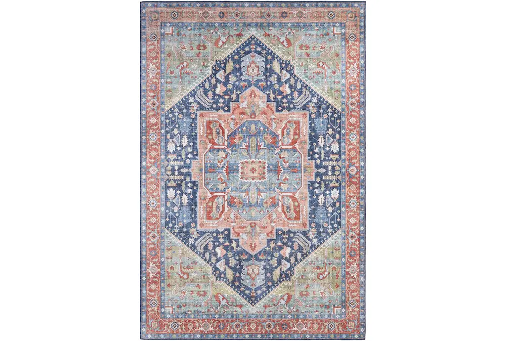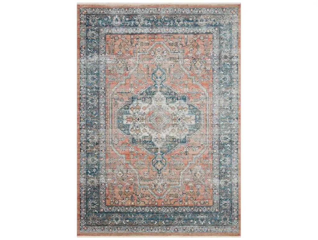 This 9'x12' rug features a beautiful Fiona Medallion design in shades of blue, peach, and green, with a low pile and made of durable fiber material. Perfect for indoor use and layering in a rustic dining room, this rug adds a touch of elegance to any space.