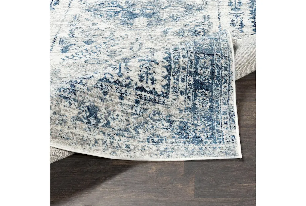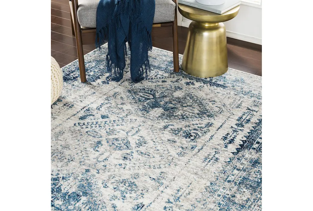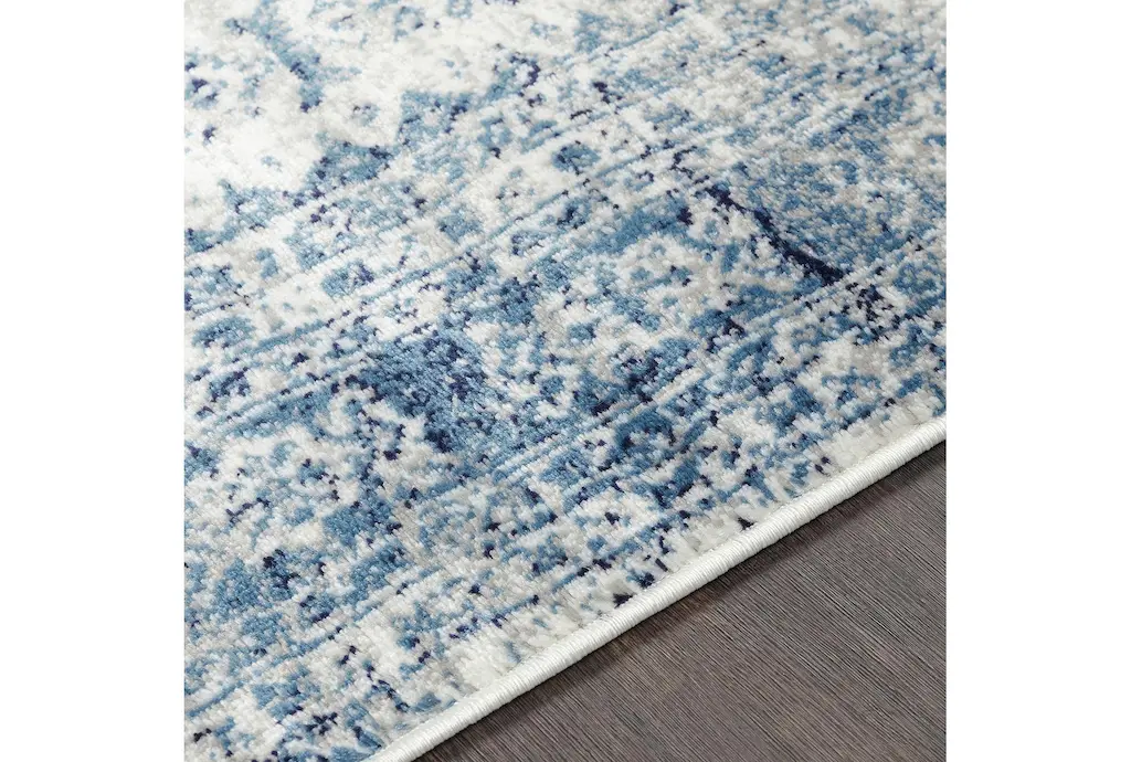 Transform any room with the 9'x12' Fiber Rug in Traditional Blue by Surya. This stylish indoor rug features a captivating sky blue, light grey, white, and navy color palette, adding a touch of sophistication to your dining or living room. Its low pile construction offers a soft feel underfoot while ensuring easy maintenance.