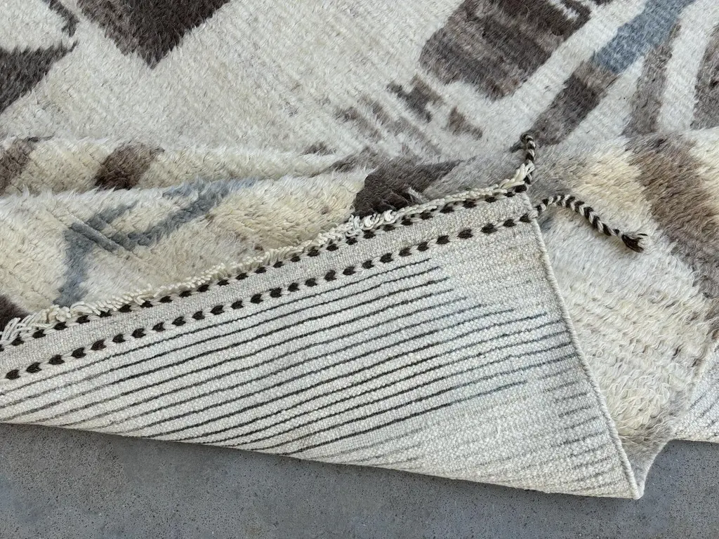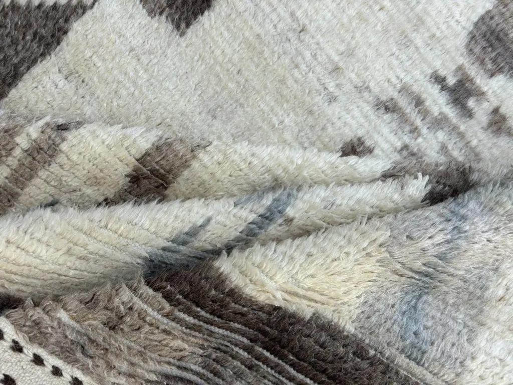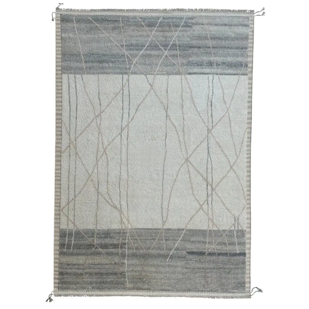 Elevate your living space with the exquisite charm of this new modern hand-knotted Moroccan Berber Beni Ourain design rug, crafted with precision and care from 100% wool. Combining the allure of Moroccan style with contemporary sensibilities, this rug is a striking addition to any home, offering both style and substance in equal measure.Each knot is meticulously handcrafted by skilled artisans, resulting in a texture that is both luxurious and resilient.Crafted entirely from wool, this Tulu rug offers warmth, softness, and durability, making it a practical and inviting choice for any room in your home. Whether placed in a living room, bedroom, or even a home office, this rug adds a touch of elegance and comfort to your space.As a new addition to your home, this modern Moroccan azilal style rug brings a fresh perspective to traditional craftsmanship. Its clean lines, contemporary design, and high-quality materials make it a versatile and timeless piece that will complement a wide range of interior styles.Elevate your decor with the modern sophistication of this hand-knotted Moroccan Tulu rug, where craftsmanship meets contemporary design to create a truly exceptional statement piece for your home.Size: 9 x 12 Ft (275 x 365 cm)Weaves: Hand-KnottedMaterials: 100% WoolPile Height: MediumRoom: Any Room, Guestroom, Nursery, Kid's Room, Lounge, Living Room, Kitchen, Entryway, Salon, Trailer, Home Office / Study, Garage, Foyer, Dining Room, Conservatory, Bedroom, Basement, Utility/Laundry RoomAge: NewShape: RectangleType: Area RugStyle: Moroccan Beni Ourain, ScandivanianColor: Beige CUSTOM OPTIONS AVAILABLE Ref No: H011 Please inquire about wholesale pricing