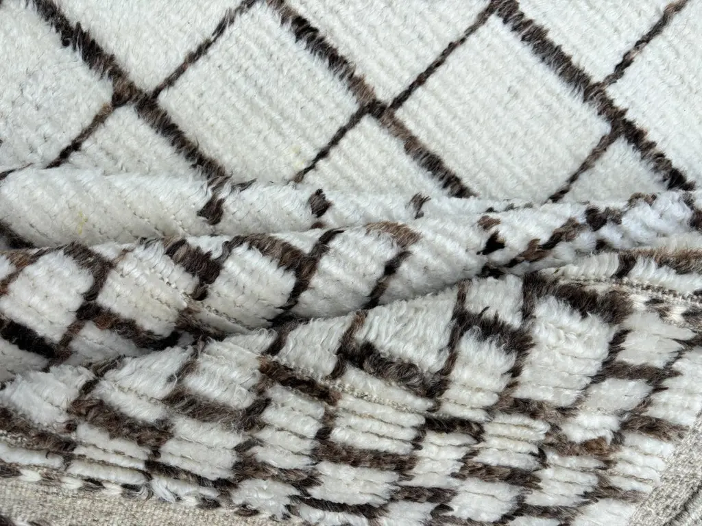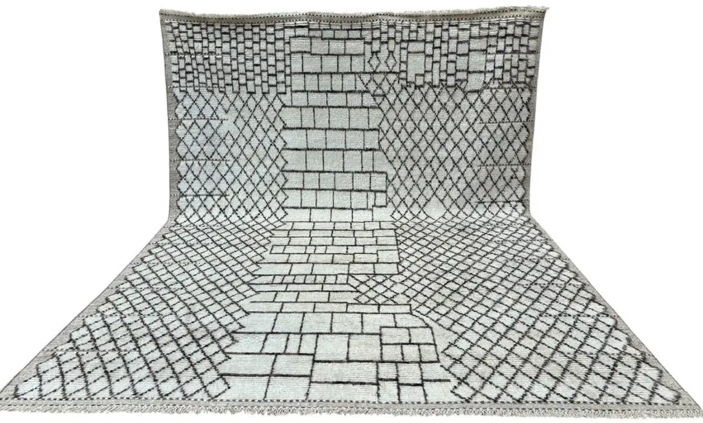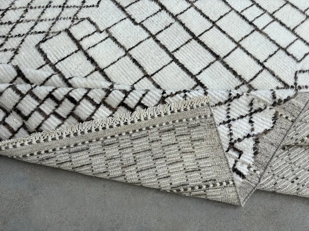 Elevate your living space with the exquisite charm of this new modern hand-knotted Moroccan berber beni ourain rug, crafted with precision and care from 100% wool. Combining the allure of Moroccan design with contemporary sensibilities, this rug is a striking addition to any home, offering both style and substance in equal measure.Each knot is meticulously handcrafted by skilled artisans, resulting in a texture that is both luxurious and resilient.Crafted entirely from wool, this Tulu rug offers warmth, softness, and durability, making it a practical and inviting choice for any room in your home. Whether placed in a living room, bedroom, or even a home office, this rug adds a touch of elegance and comfort to your space.As a new addition to your home, this modern Moroccan azilal style rug brings a fresh perspective to traditional craftsmanship. Its clean lines, contemporary design, and high-quality materials make it a versatile and timeless piece that will complement a wide range of interior styles.Elevate your decor with the modern sophistication of this hand-knotted Moroccan Tulu rug, where craftsmanship meets contemporary design to create a truly exceptional statement piece for your home.The rug is available in 9 x 12 Ft (275 x 365 cm) for fast dispatch.Size: 9 x 12 Ft (275 x 365 cm)Weaves: Hand-KnottedMaterials: 100% Natural WoolPile Height: MediumRoom: Any Room, Guestroom, Nursery, Kid's Room, Lounge, Living Room, Kitchen, Entryway, Salon, Trailer, Home Office / Study, Garage, Foyer, Dining Room, Conservatory, Bedroom, Basement, Utility/Laundry RoomAge: NewShape: RectangleType: Area Rug CUSTOM OPTIONS AVAILABLE Ref No: H051 Please inquire about wholesale pricing