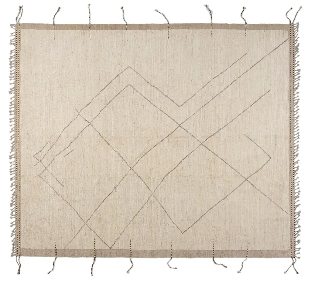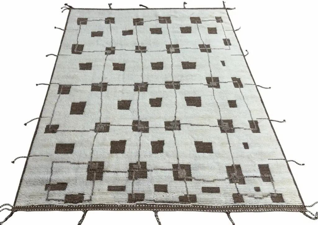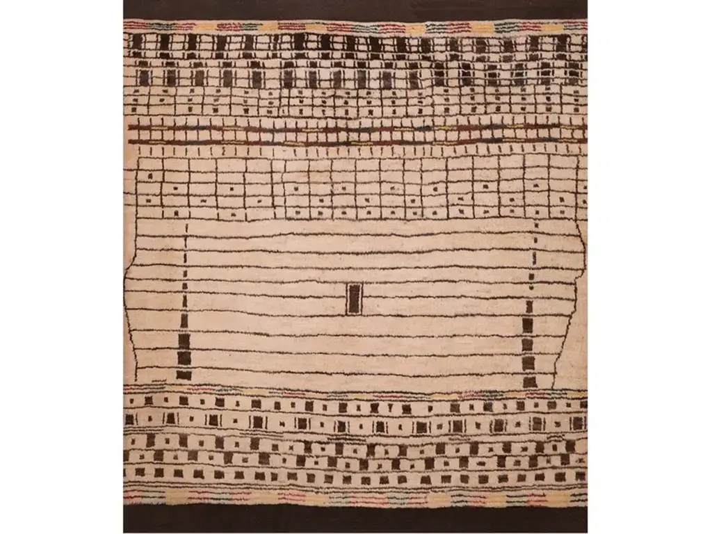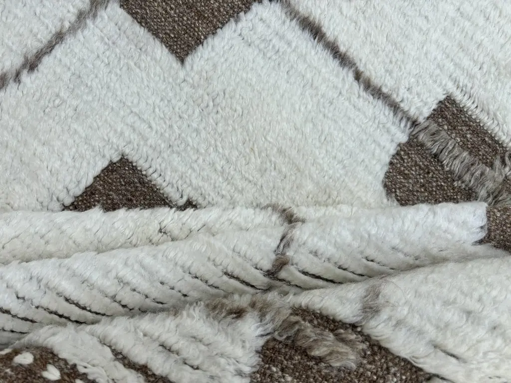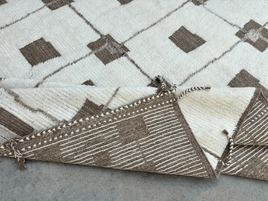 Elevate your living space with the exquisite charm of this new modern hand-knotted Moroccan Berber Beni Ourain design rug, crafted with precision and care from 100% wool. Combining the allure of Moroccan style with contemporary sensibilities, this rug is a striking addition to any home, offering both style and substance in equal measure.Each knot is meticulously handcrafted by skilled artisans, resulting in a texture that is both luxurious and resilient.Crafted entirely from wool, this Tulu rug offers warmth, softness, and durability, making it a practical and inviting choice for any room in your home. Whether placed in a living room, bedroom, or even a home office, this rug adds a touch of elegance and comfort to your space.As a new addition to your home, this modern Moroccan azilal style rug brings a fresh perspective to traditional craftsmanship. Its clean lines, contemporary design, and high-quality materials make it a versatile and timeless piece that will complement a wide range of interior styles.Elevate your decor with the modern sophistication of this hand-knotted Moroccan Tulu rug, where craftsmanship meets contemporary design to create a truly exceptional statement piece for your home.Size: 9 x 12 Ft (275 x 365 cm)Weaves: Hand-KnottedMaterials: 100% WoolPile Height: MediumRoom: Any Room, Guestroom, Nursery, Kid's Room, Lounge, Living Room, Kitchen, Entryway, Salon, Trailer, Home Office / Study, Garage, Foyer, Dining Room, Conservatory, Bedroom, Basement, Utility/Laundry RoomAge: NewShape: RectangleType: Area RugStyle: Moroccan Beni Ourain, Scandivanian CUSTOM OPTIONS AVAILABLE Ref No: H018 Please inquire about wholesale pricing