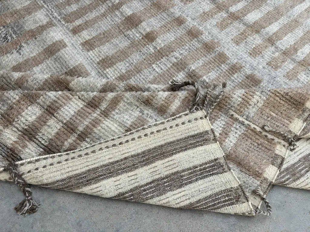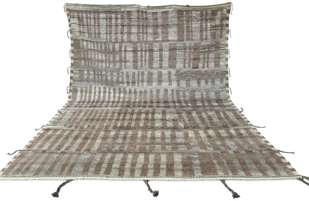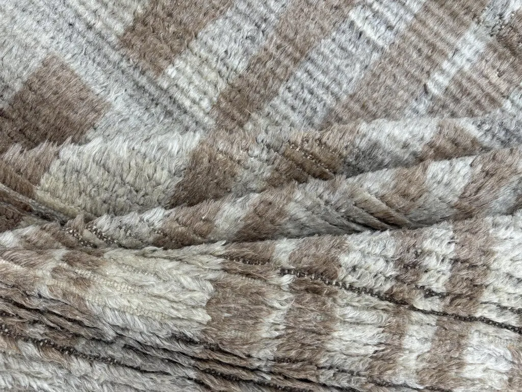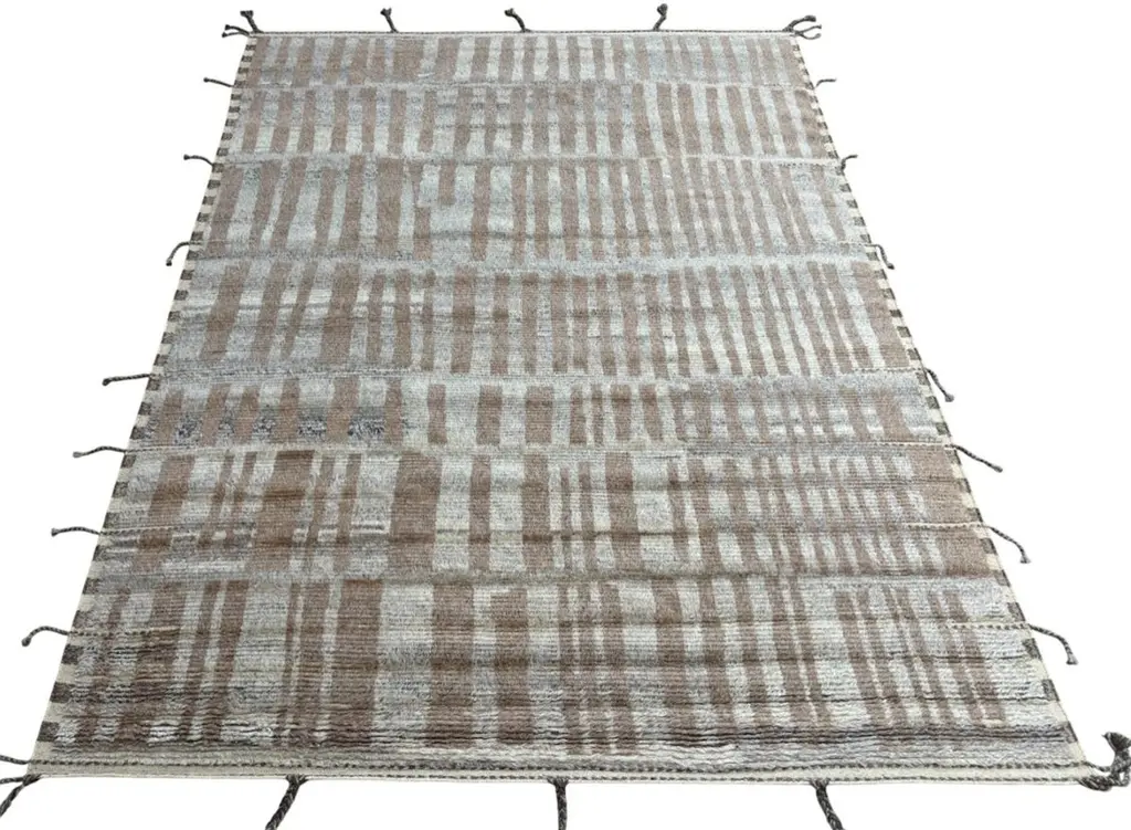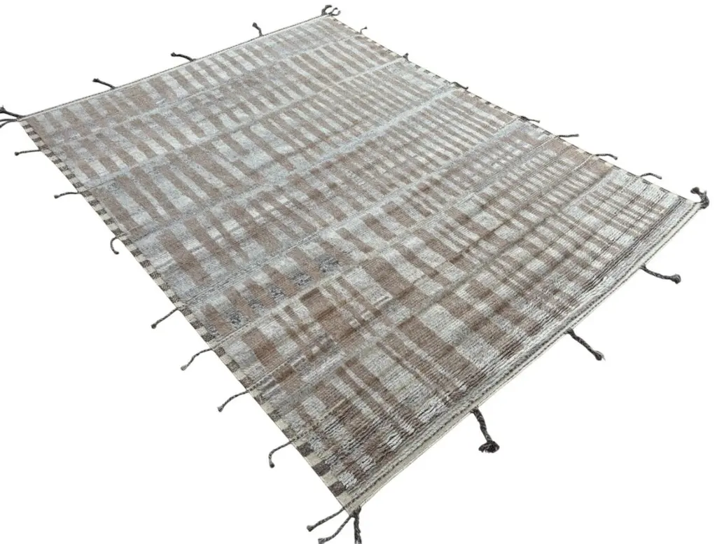 Elevate your living space with the exquisite charm of this new modern hand-knotted Moroccan Berber Beni Ourain design rug, crafted with precision and care from 100% wool. Combining the allure of Moroccan style with contemporary sensibilities, this rug is a striking addition to any home, offering both style and substance in equal measure.Each knot is meticulously handcrafted by skilled artisans, resulting in a texture that is both luxurious and resilient.Crafted entirely from wool, this Tulu rug offers warmth, softness, and durability, making it a practical and inviting choice for any room in your home. Whether placed in a living room, bedroom, or even a home office, this rug adds a touch of elegance and comfort to your space.As a new addition to your home, this modern Moroccan azilal style rug brings a fresh perspective to traditional craftsmanship. Its clean lines, contemporary design, and high-quality materials make it a versatile and timeless piece that will complement a wide range of interior styles.Elevate your decor with the modern sophistication of this hand-knotted Moroccan Tulu rug, where craftsmanship meets contemporary design to create a truly exceptional statement piece for your home.Size: 9 x 12 Ft (275 x 365 cm)Weaves: Hand-KnottedMaterials: 100% WoolPile Height: MediumRoom: Any Room, Guestroom, Nursery, Kid's Room, Lounge, Living Room, Kitchen, Entryway, Salon, Trailer, Home Office / Study, Garage, Foyer, Dining Room, Conservatory, Bedroom, Basement, Utility/Laundry RoomAge: NewShape: RectangleType: Area RugStyle: Moroccan Beni Ourain, Scandivanian CUSTOM OPTIONS AVAILABLE Ref No: H020 Please inquire about wholesale pricing