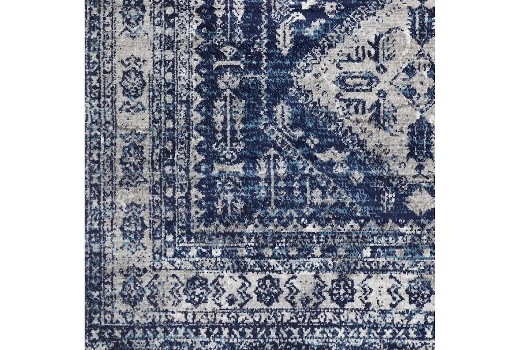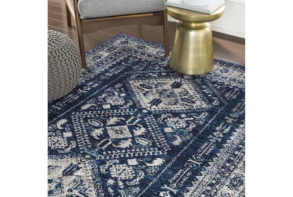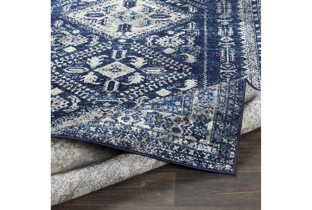 Enhance the charm of your home with the 9'x12' Traditional Navy Fiber Rectangle Rug by Surya. This indoor rug features a beautiful blend of navy, light grey, sky blue, and white, creating a timeless and sophisticated look. Made from 100% polypropylene, it is durable and easy to maintain, perfect for high-traffic areas like your dining room or living room.
