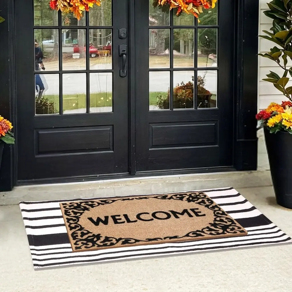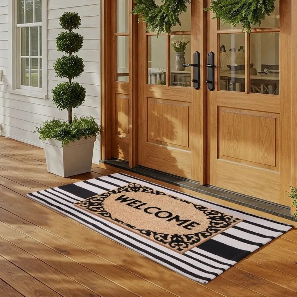 A1hc 100% Coir Welcome Mat 24"x36" & 24"x51" Black And White Striped Rug Combo Set - Welcome Floral Border With Striped Rug