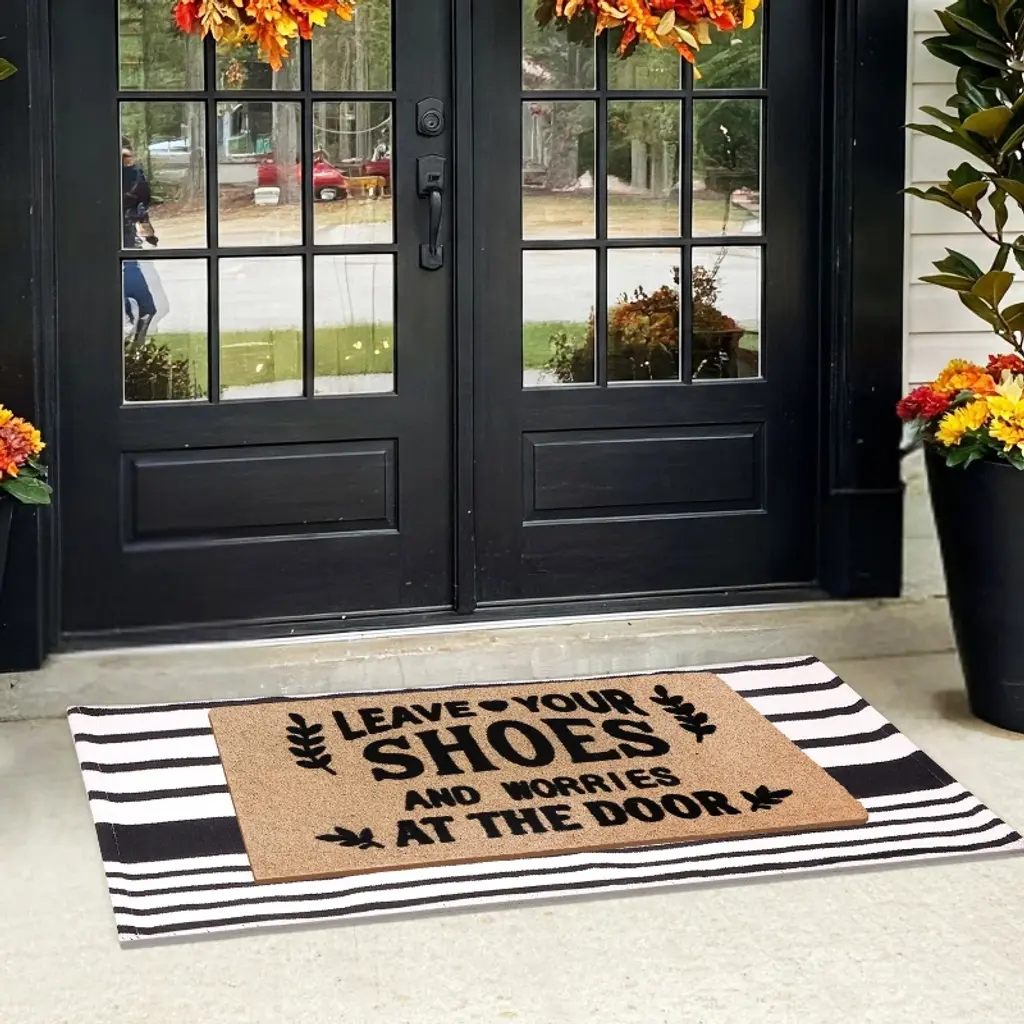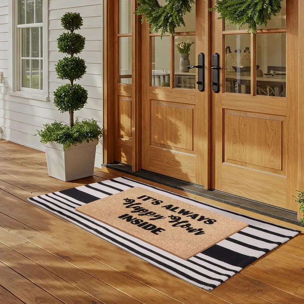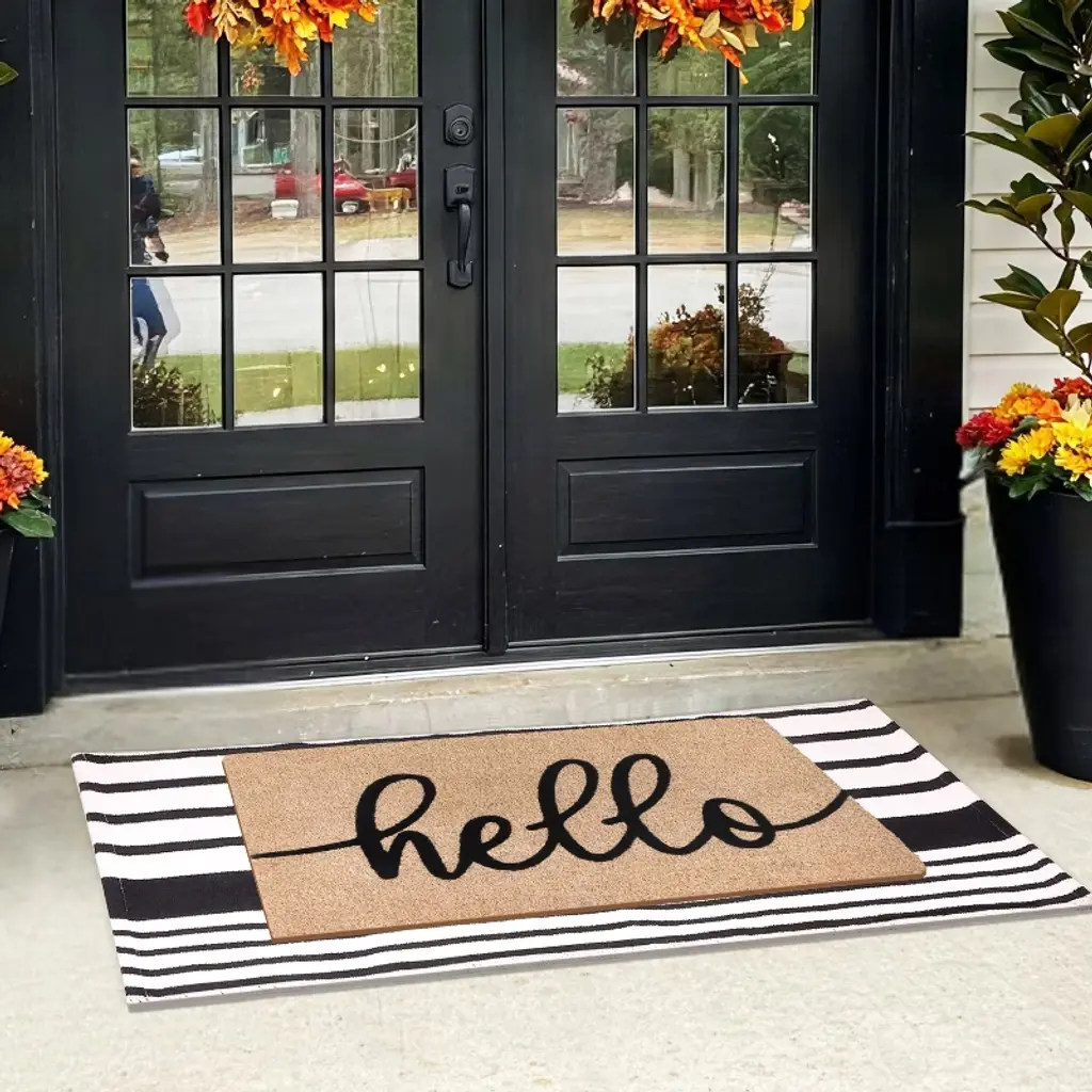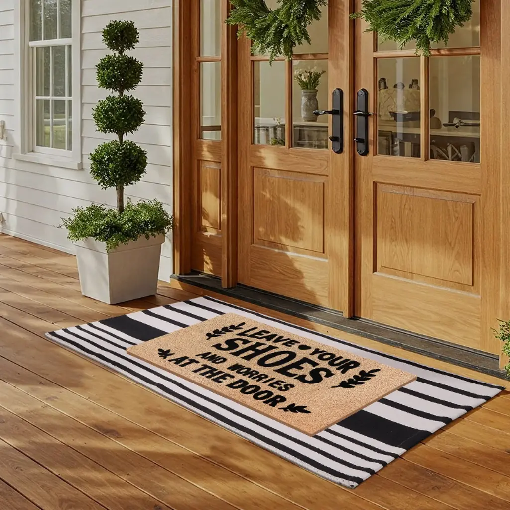 A1hc 100% Coir Welcome Mat With Black And White Striped Rug Combo Sets 24" X 36"