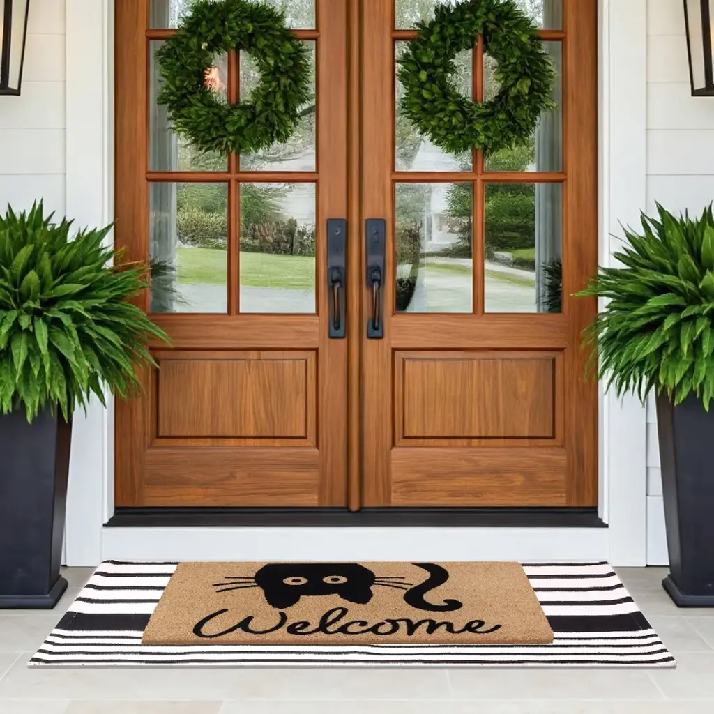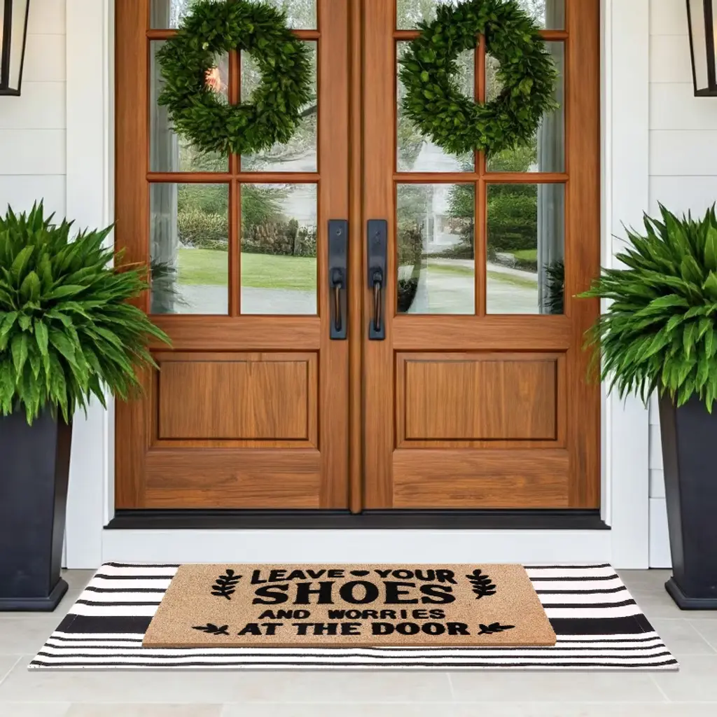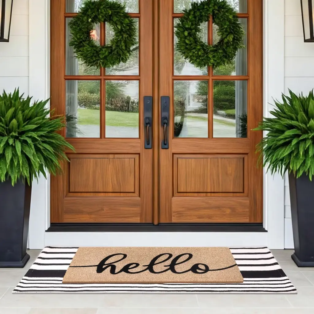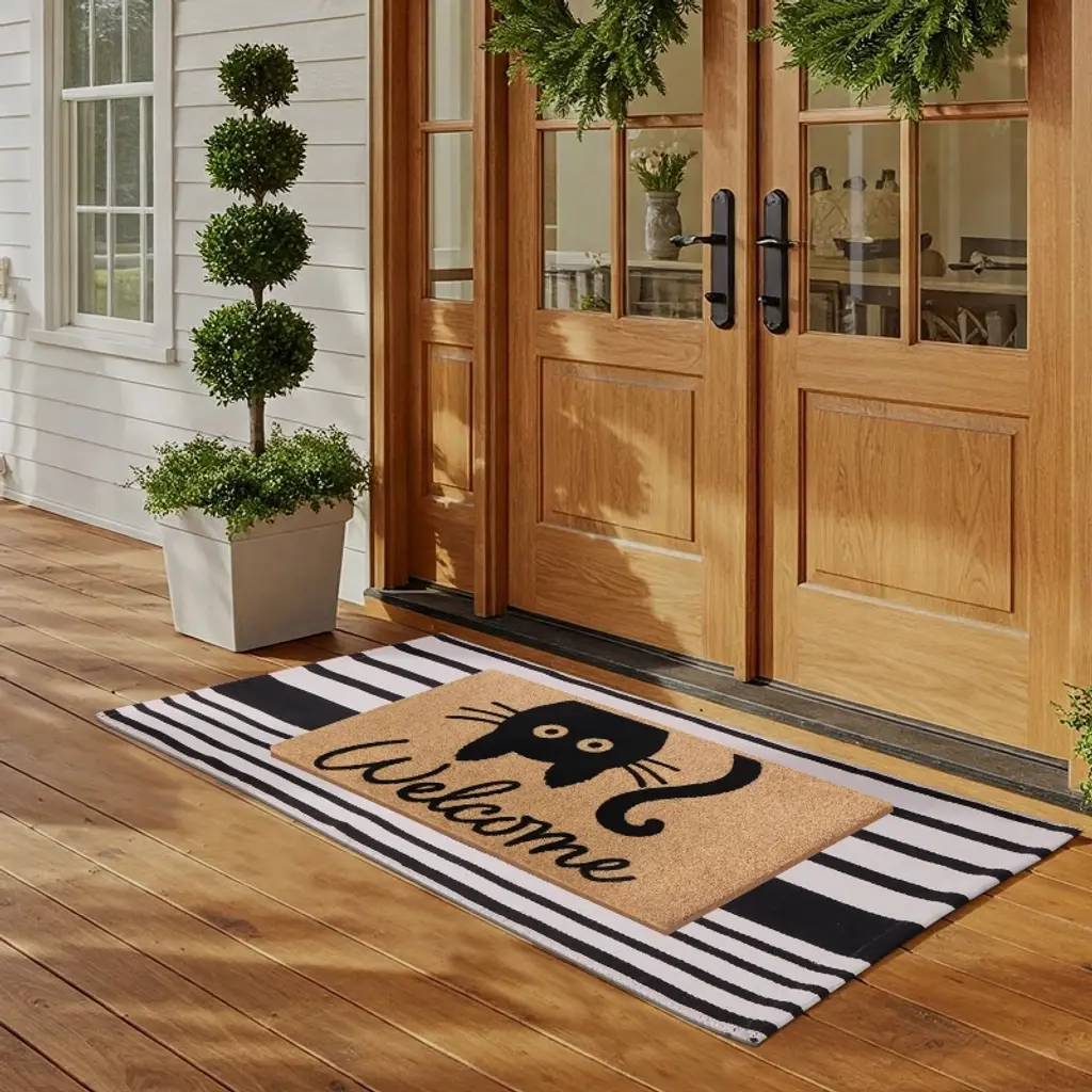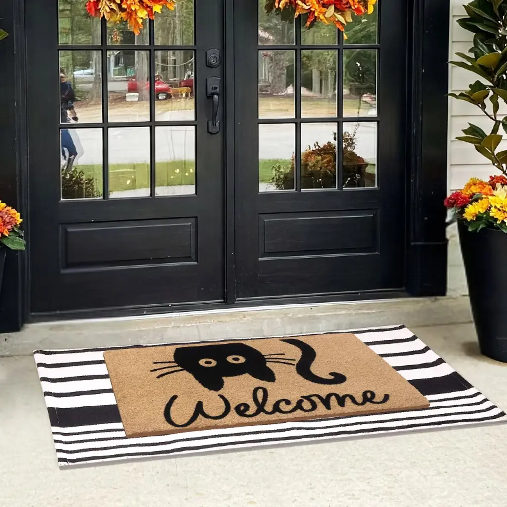 A1hc 100% Coir Welcome Mat With Black And White Striped Rug Combo Sets 24" X 36"
