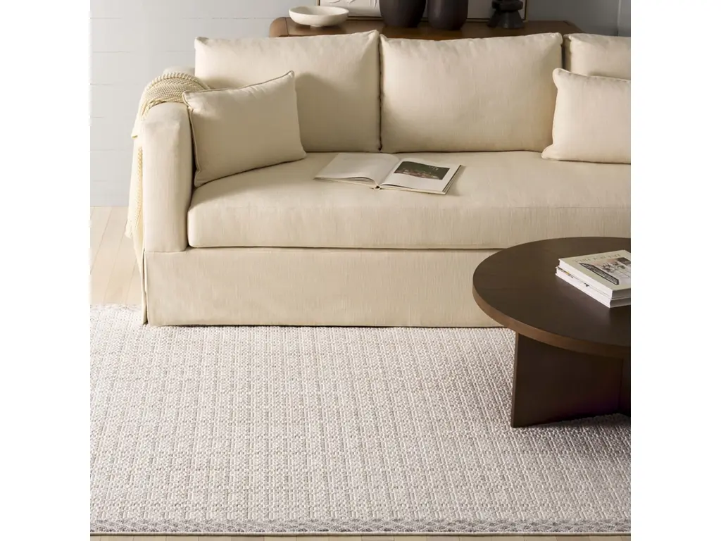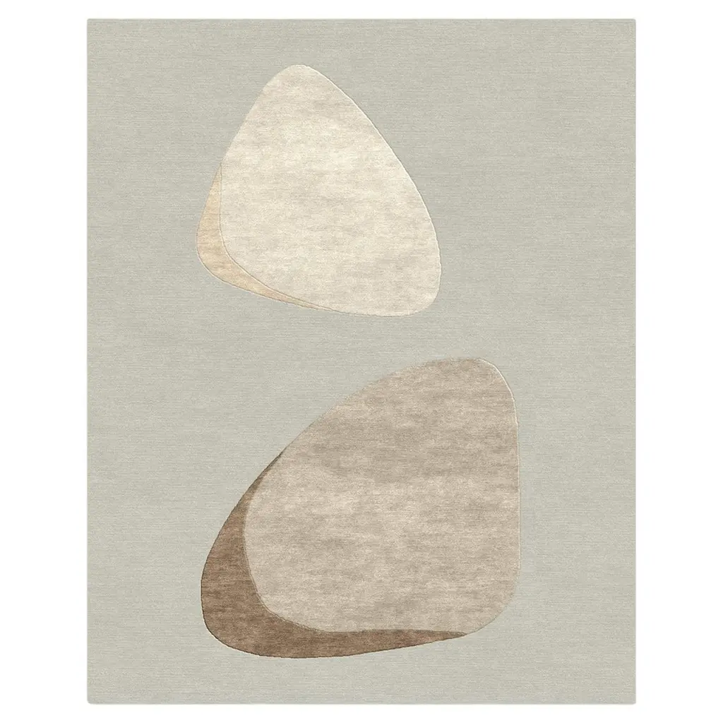 The AALAND rugs are characterized by a particularly original and distinctive graphic pattern. The design consists of two organic rounded shapes, each with different fills and textures, creating an interesting visual contrast. These two shapes, while maintaining some visual independence, are connected by a graphic element that can be interpreted as a sort of stylized suture.