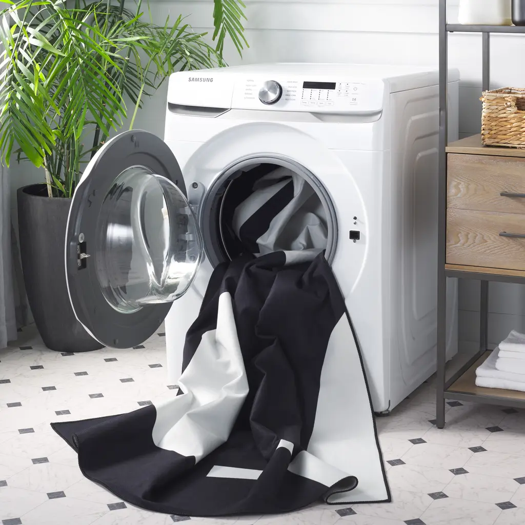 The AALAND rugs are characterized by a particularly original and distinctive graphic pattern. The design consists of two organic rounded shapes, each with different fills and textures, creating an interesting visual contrast. These two shapes, while maintaining some visual independence, are connected by a graphic element that can be interpreted as a sort of stylized suture.