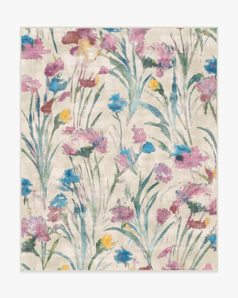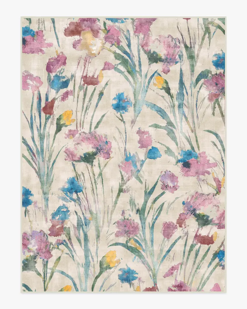 Inspired by a windswept, grassy meadow, our Abeline Multicolor Rug captures the flowy movement of stems and leaves. Gestural brushstrokes of spring hues like pink, purple, lavender, magenta, blue, bright yellow, and green add a painterly quality to an ivory background. Water-resistant, stain-resistant, and machine-washable. Rug colors may vary slightly according to your device and the lighting in your space.