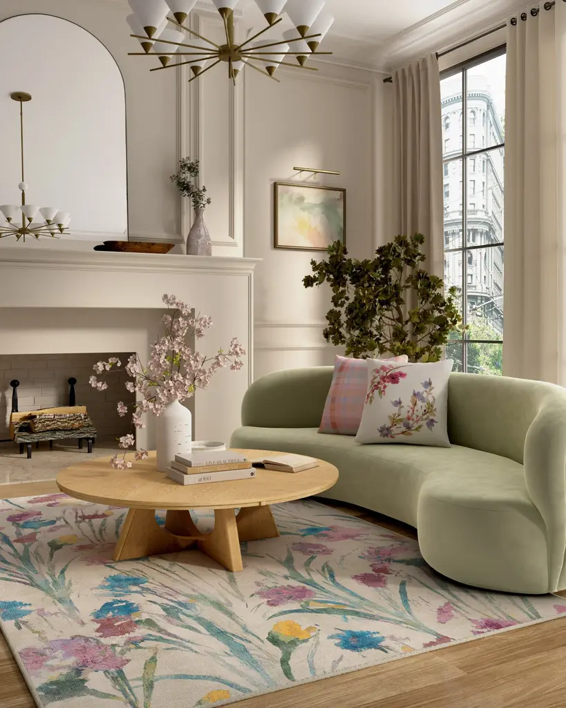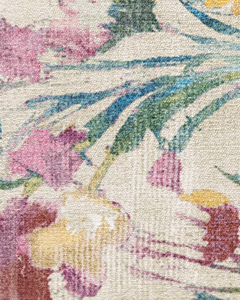 Inspired by a windswept, grassy meadow, our Abeline Multicolor Rug captures the flowy movement of stems and leaves. Gestural brushstrokes of spring hues like pink, purple, lavender, magenta, blue, bright yellow, and green add a painterly quality to an ivory background. Water-resistant, stain-resistant, and machine-washable. Rug colors may vary slightly according to your device and the lighting in your space.