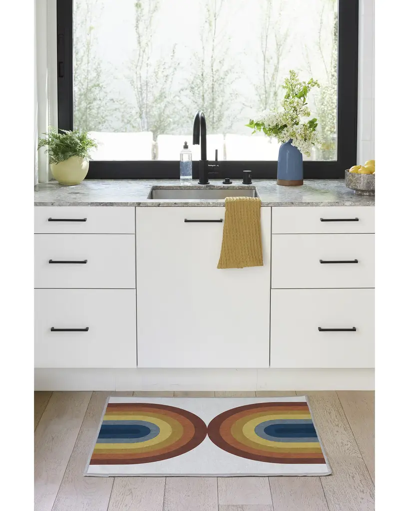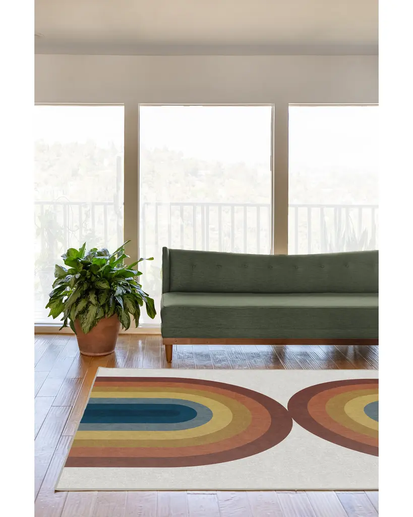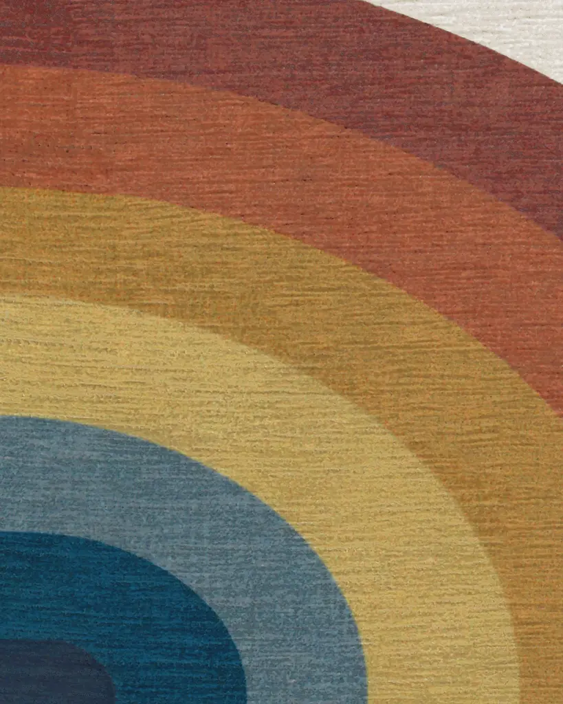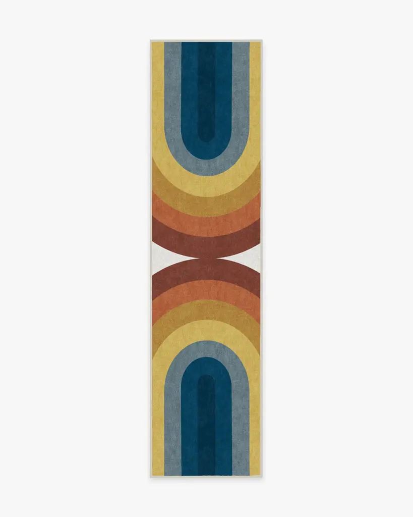Influenced by the designs of Bauhaus artist Josef Albers, Absida Rainbow Rug brings a touch of retro-chic into your home. With mirrored arches in graduated shades of blue, yellow, and red, this rainbow rug uses radiating colors and creative composition to elevate your space.