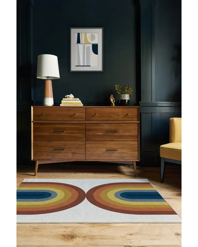Influenced by the designs of Bauhaus artist Josef Albers, Absida Rainbow Rug brings a touch of retro-chic into your home. With mirrored arches in graduated shades of blue, yellow, and red, this rainbow rug uses radiating colors and creative composition to elevate your space. Water-resistant, stain-resistant, and machine-washable.