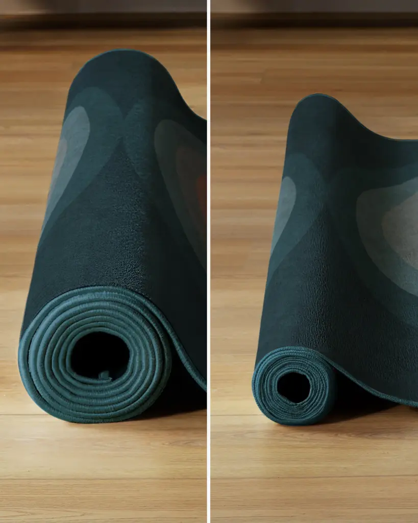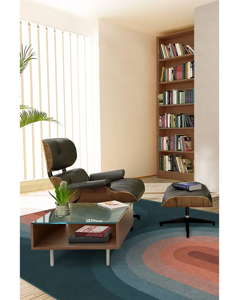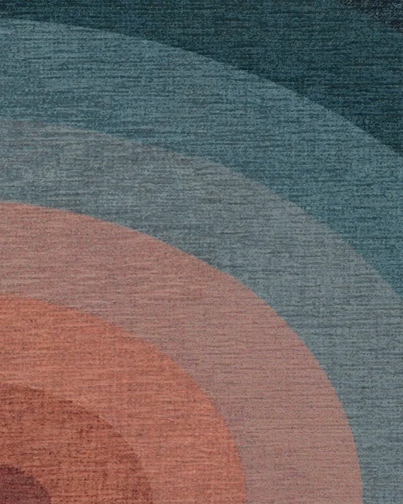 Our Absida Teal Rug takes inspiration from Bauhaus artist Josef Albers and plays up the interaction between color and composition. This modern abstract rug design features mirrored arches tinted in a deep teal background that graduates to copper and rosewood, creating a glowing effect. Water-resistant, stain-resistant, and machine-washable.