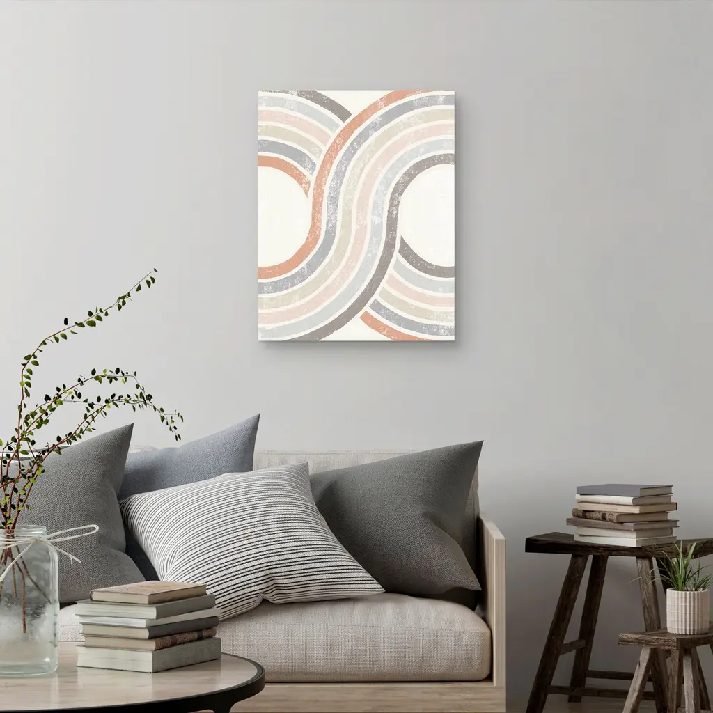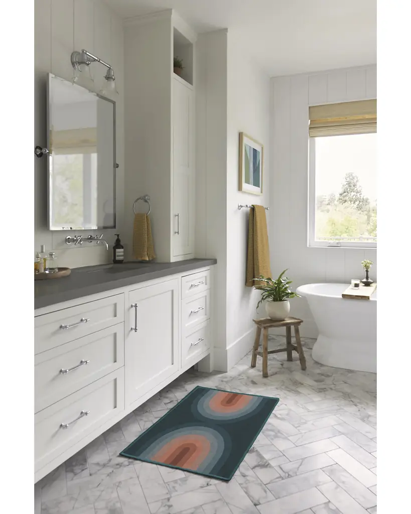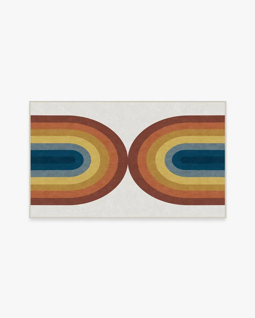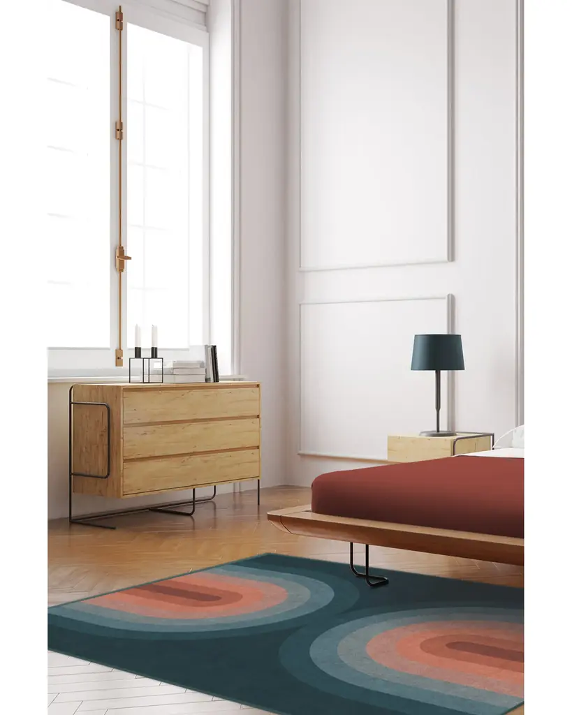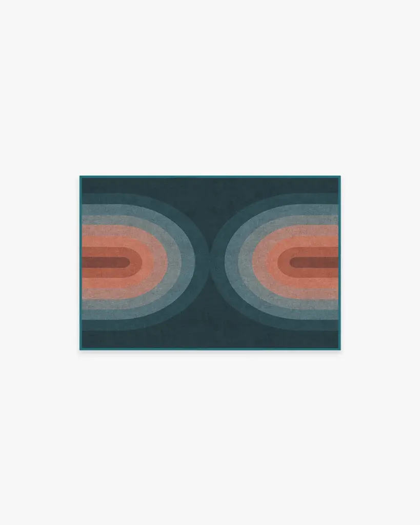 Our Absida Teal Rug takes inspiration from Bauhaus artist Josef Albers and plays up the interaction between color and composition. This modern abstract rug design features mirrored arches tinted in a deep teal background that graduates to copper and rosewood, creating a glowing effect.