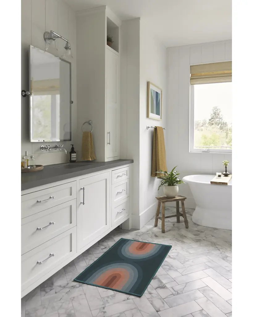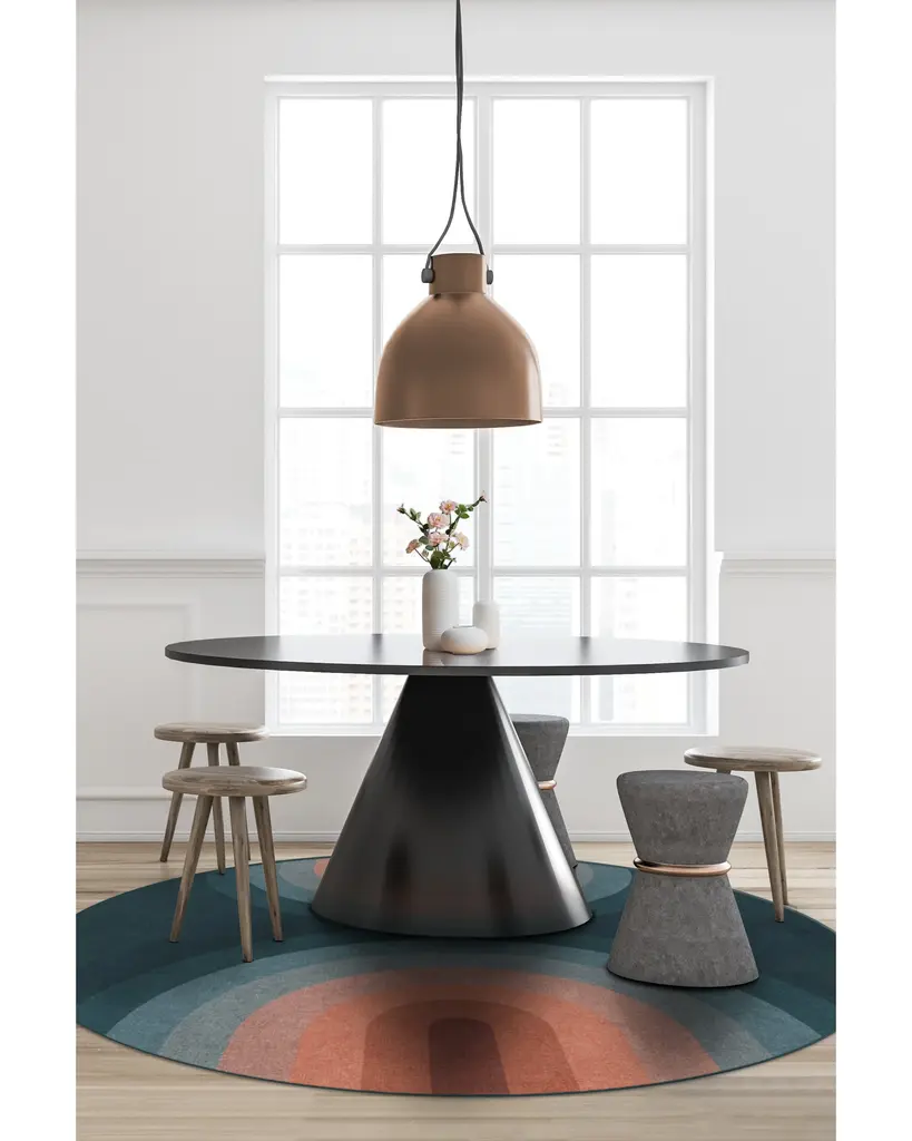Our Absida Teal Rug takes inspiration from Bauhaus artist Josef Albers and plays up the interaction between color and composition. This modern abstract rug design features mirrored arches tinted in a deep teal background that graduates to copper and rosewood, creating a glowing effect. Water-resistant, stain-resistant, and machine-washable.