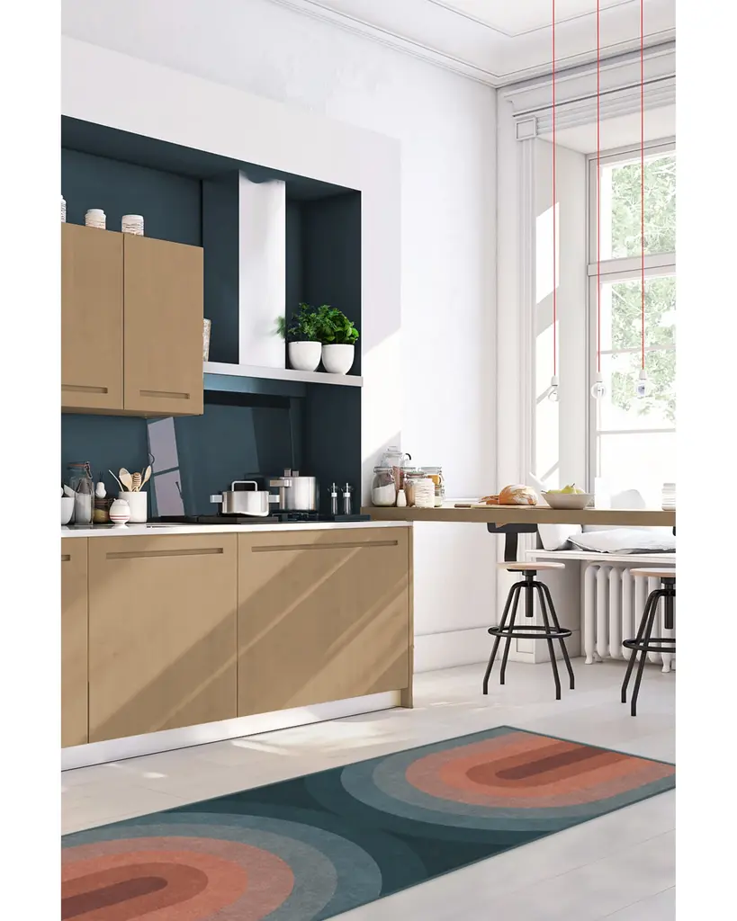 Our Absida Teal Rug takes inspiration from Bauhaus artist Josef Albers and plays up the interaction between color and composition. This modern abstract rug design features mirrored arches tinted in a deep teal background that graduates to copper and rosewood, creating a glowing effect. Water-resistant, stain-resistant, and machine-washable.