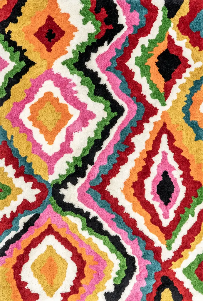 A rug you can't help but stop and stare! Perfect for a nursery, playroom, or any area needing some fun, this area rug features a rainbow circle pattern. The luxurious composition offers a soft texture under foot. Choose from a variety of shapes and sizes. To capture the lavish essence of your new area rug upon arrival, we recommend to gently fluff the shag rug by using a stiff brush, vacuum safe for high-pile rugs or your hand. Make the most of your time at home with our pet-friendly and easy to clean area rugs.