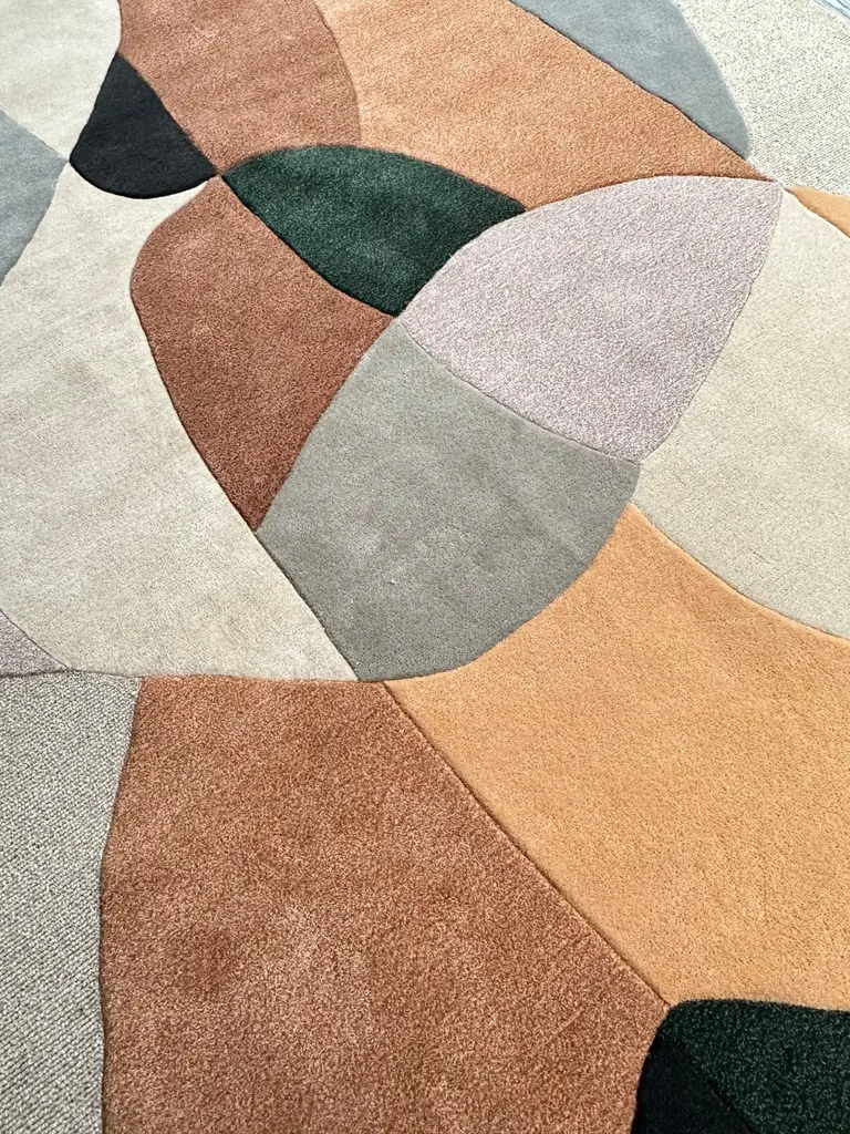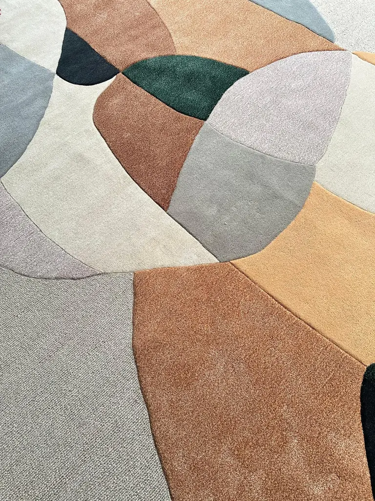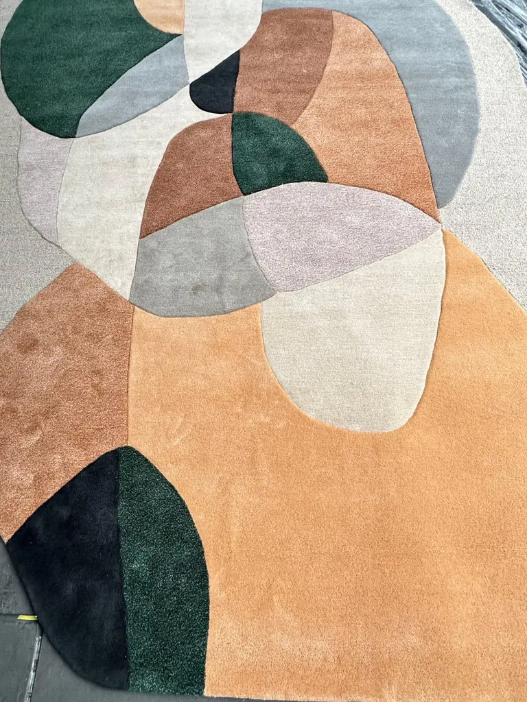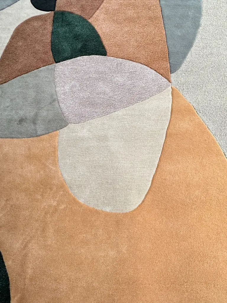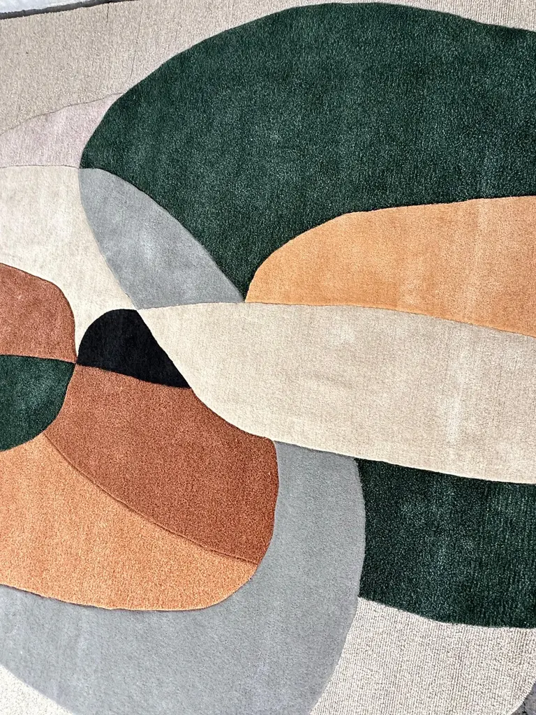 This rug features an abstract, modern design with an organic, freeform shape. The color palette includes earthy tones like beige, terracotta, deep green, gray, and cream, creating a harmonious and artistic composition. The curved and layered geometric shapes give it a contemporary and sophisticated look.