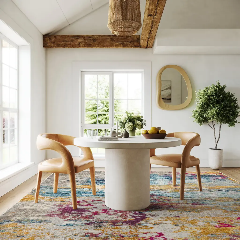 With its bright and plentiful color scheme, this area rug takes your space to new heights. An abstract pattern mimicking the wonder of nebulas and far, far away come together to bring a unique, daring look for any high-traffic area in your home. The luxurious texture provides a spa-like texture under foot. Choose from our wide assortment of sizes and elevate your living space with our pet-friendly and easy to clean rugs.