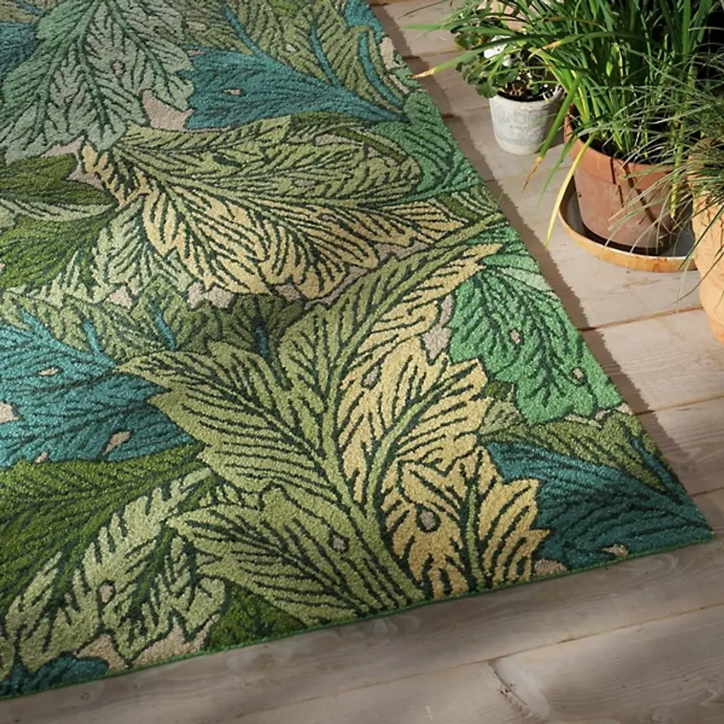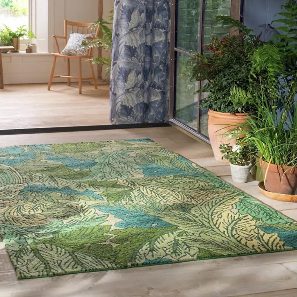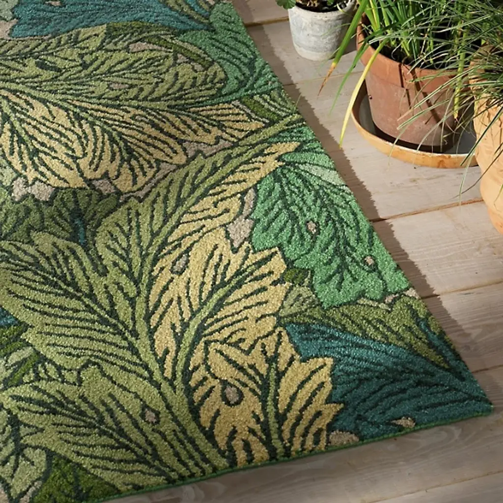 The Acanthus Indoor/Outdoor Area Rug from Morris & Co combines vintage inspiration with modern production methods. Sustainably made from recycled PET yarn hand-tufted by Indian artisans, it shows off a stylized William Morris pattern originally made in 1875, showing off vibrant, curling leaves contrasting with the background. The surface is soft, and the pattern is refined enough for interiors while remaining tough enough to go outdoors.
