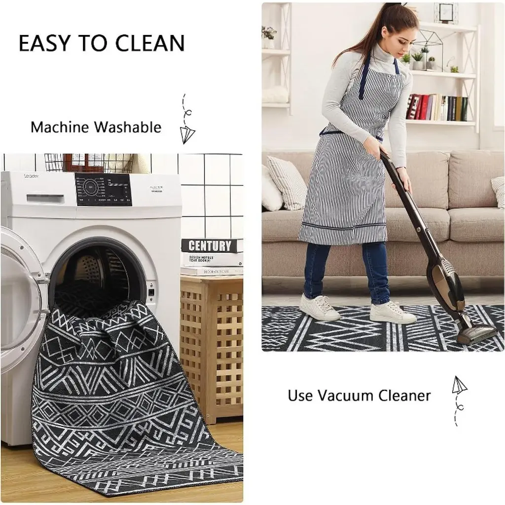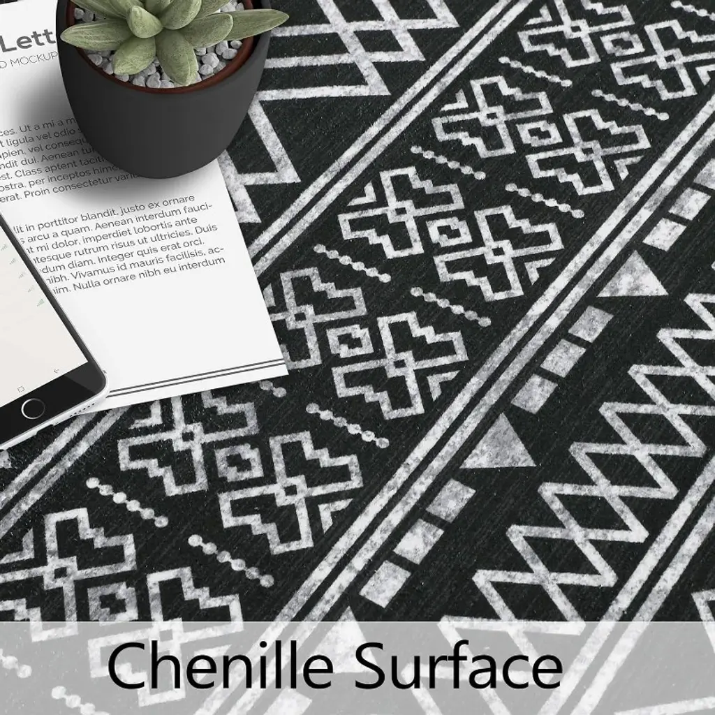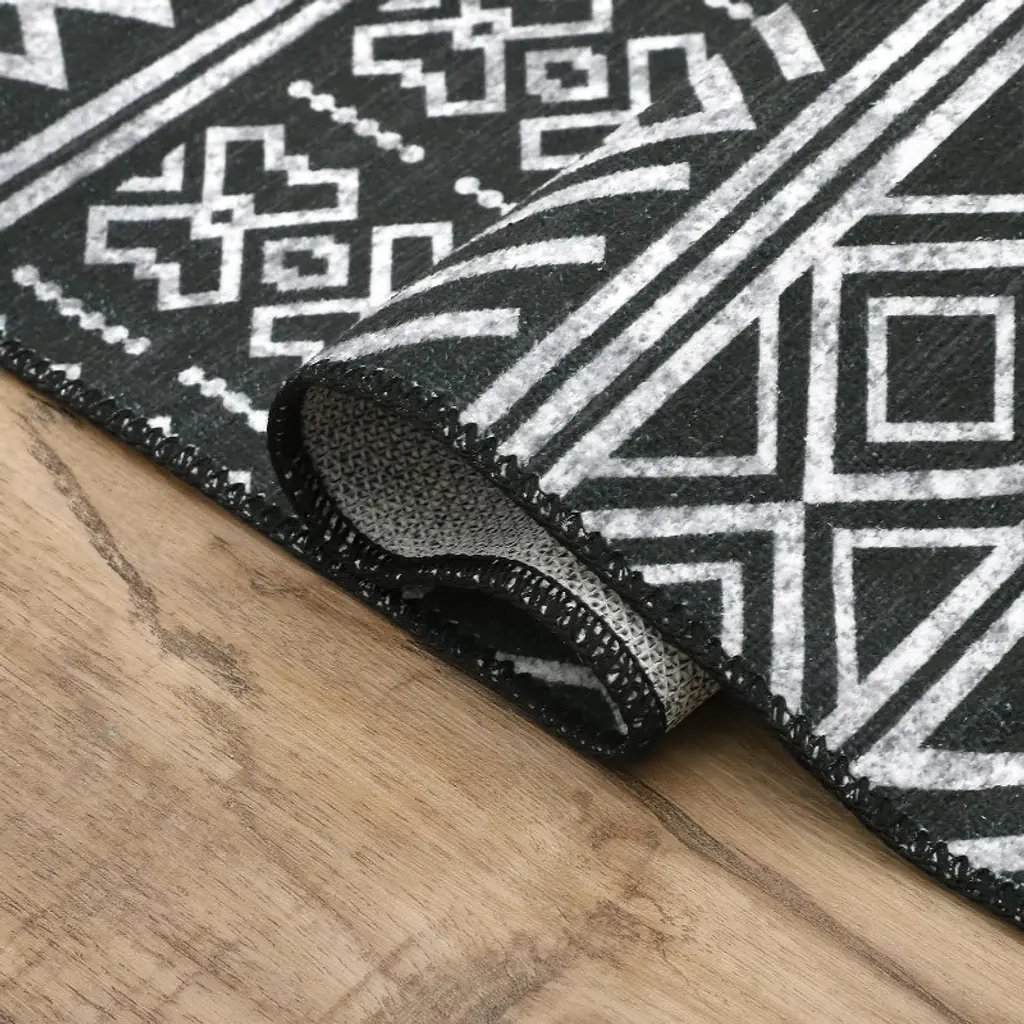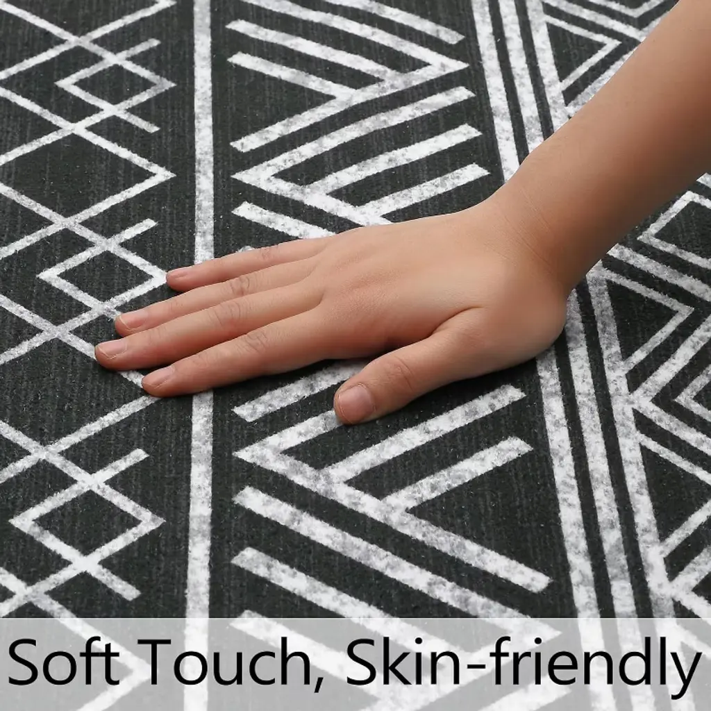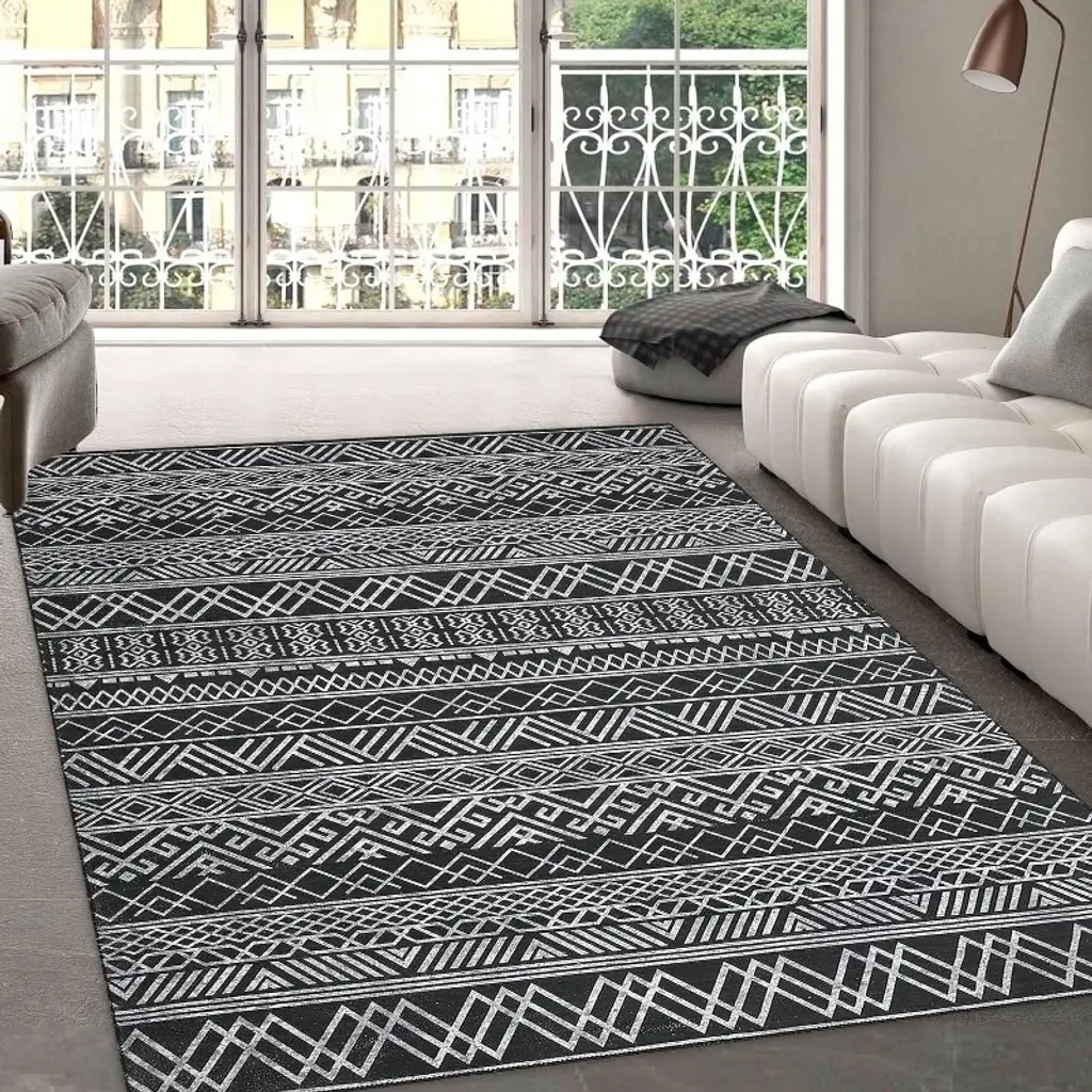 The Acekool Geometric Area Rug combines modern style with everyday practicality. Its washable design makes maintenance simple for busy households. Ideal for living rooms, bedrooms or kids' spaces. The black and white boho pattern adds character while hiding everyday wear. The non-slip backing provides safety on all floor types. Measures 8' x 10' with a 0.3" pile height. The lightweight construction makes it easy to move and clean. Coordinates well with contemporary and minimalist decor.