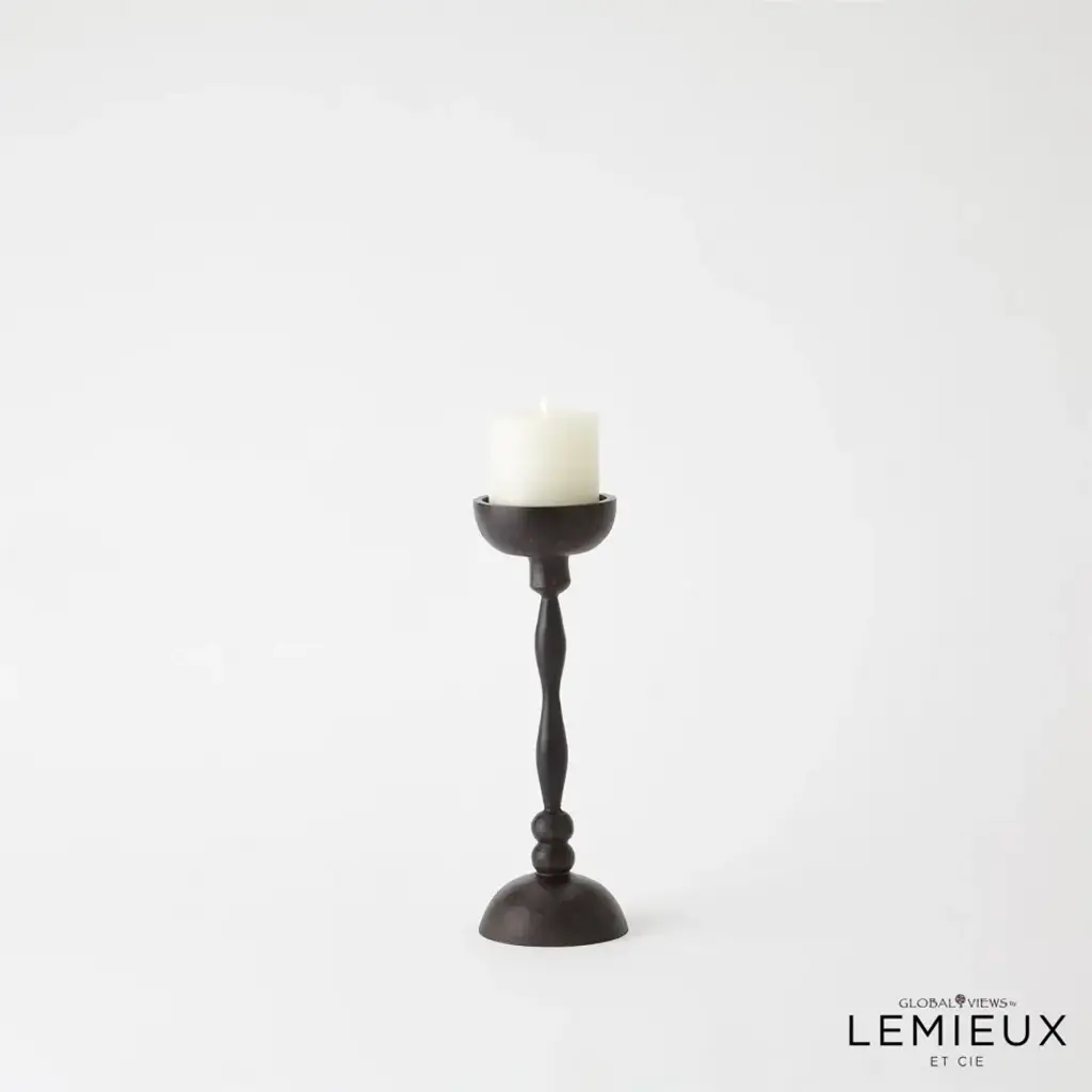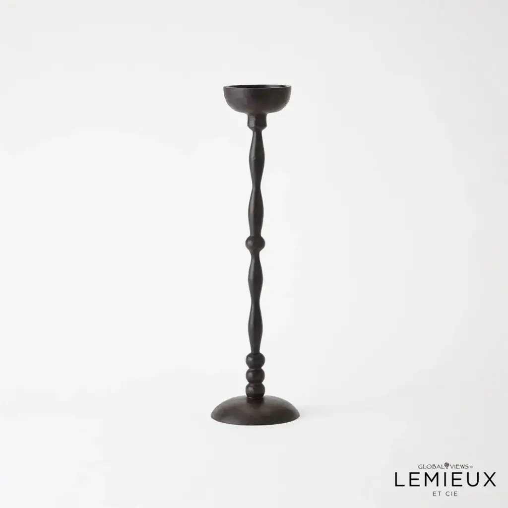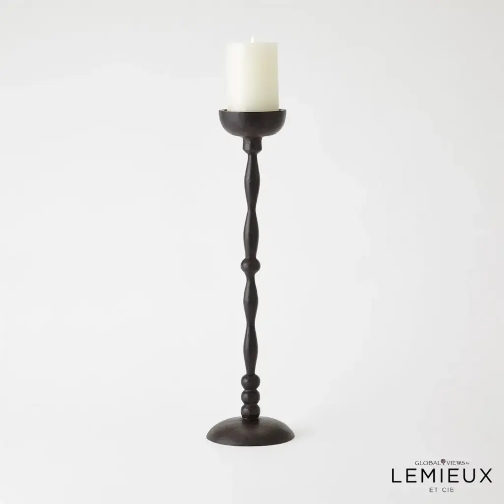 The Achille Candle Holder combines the strength of hand-forged metalwork with delicate and intricate details. The dark finish enhances the ornate beaded design. This candle holder is a captivating centerpiece that adds a touch of design and decoration to any space. From a fashion forward perspective, Global Views offers accessories, furniture, statement lighting, and an assortment of rugs and mirrors to add beauty and joy to your home.