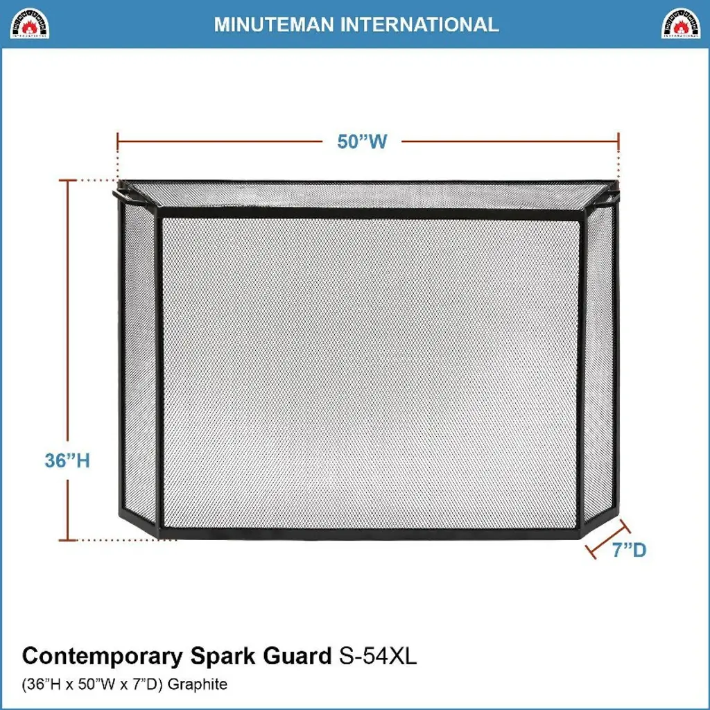 Protect your family and furnishings from flying sparks with this simple unobtrusive Contemporary Spark Guard Screen. The angled design fits close at the top and sides, allowing fully screened safe enjoyment of the fire. Two simple wrought iron handles are provided to easily move the screen aside for fire-tending. Constructed of wrought iron with wire mesh, powder coated in Graphite, for a clean modern look. Available in three sizes to fit all fireplaces, whether you have an older home or newly constructed one. Add one of our Minuteman International, all wool, flame-resistant, Contemporary Rectangular Hearth Rugs for cozy winter nights at the fireside.