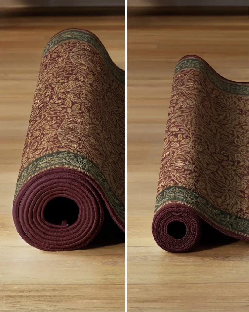 Celebrate the season with our Morris & Co. Acorn Amber Red Rug. This traditional red style showcases a pattern of acorn branches, faithfully recreated from the original 1879 Morris & Co. hand printing blocks. The rich red center is adorned with elegant gold and cream motifs, while a deep green border with gold accents enriches the overall design. The velvety textures of the reds and greens enhance the rug's rich aesthetic, making it ideal for festive occasions and everyday elegance. Water-resistant, stain-resistant, and machine-washable. Rug colors may vary slightly according to your device and the lighting in your space.