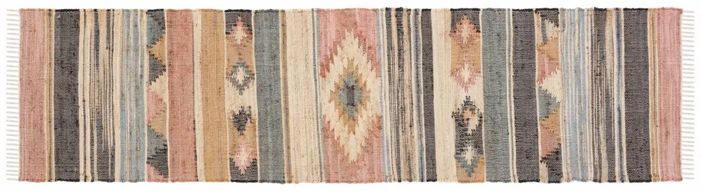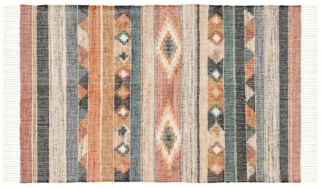 Introducing our exquisite large rectangle area rug, a statement piece measuring an expansive 10 feet by 14 feet to anchor and define any room. Boasting a harmonious blend of serene blue hues complemented by warm rust accents, this rug adds a touch of elegance and an inviting aura to your space. Handcrafted in India with meticulous attention to detail, our rug showcases the time-honored Flat Weave technique, renowned for its durability and lightweight design. The rug's pattern, as depicted in the image, features an enchanting array of geometric and abstract motifs, arranged in well-defined horizontal stripes that create a sense of visual rhythm and balance. This eye-catching pattern imbues the room with a blend of traditional charm and contemporary flair, making it suitable for a vast array of interior styles. The refined craftsmanship of this rug is underscored by its composition of 80% sustainable jute and 20% soft cotton. The use of jute, a naturally strong fiber, ensures that your rug is not only eco-friendly but also inherently durable and suited for high-traffic areas. The inclusion of cotton provides a gentle softness underfoot, making this rug as comfortable as it is striking. With a comfortable 1/4-inch pile height, the rug is an ideal choice for ease of maintenance and effortless integration into your home, whether placed under furniture or as a stand-alone centerpiece. Its flat weave construction means it's less prone to shedding and perfect for those who favor a low-profile aesthetic.