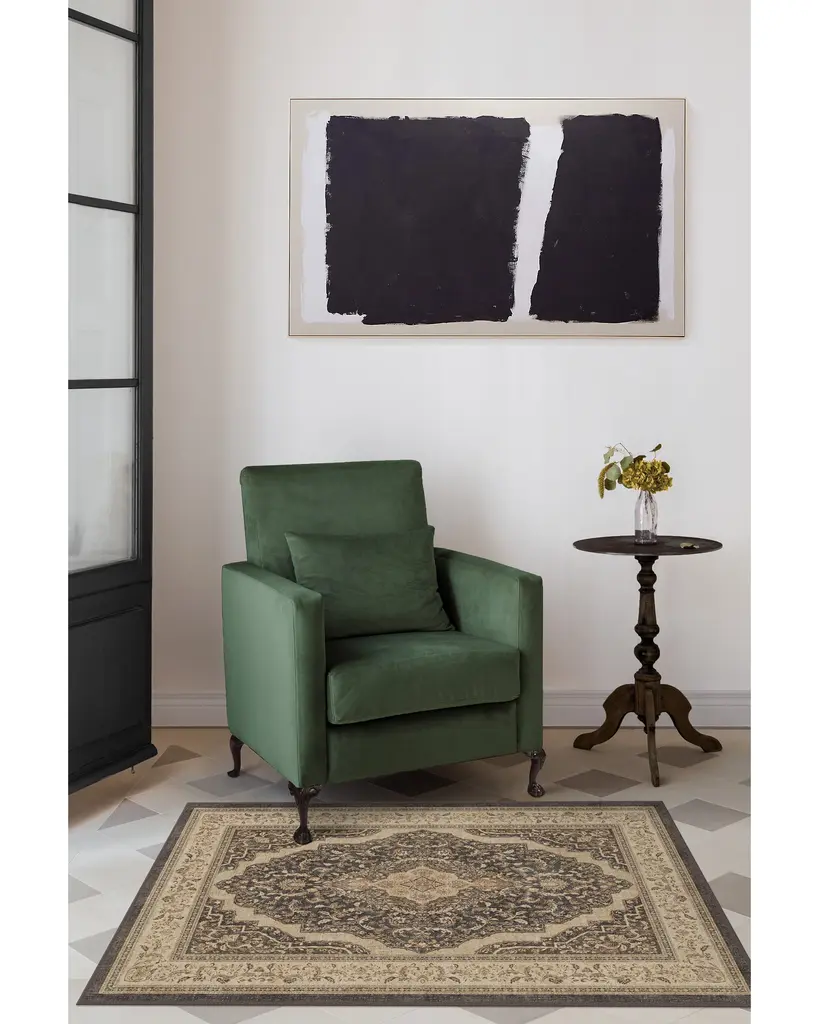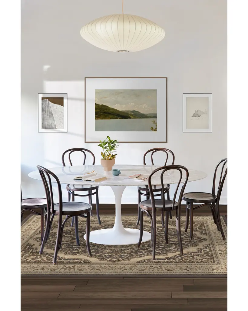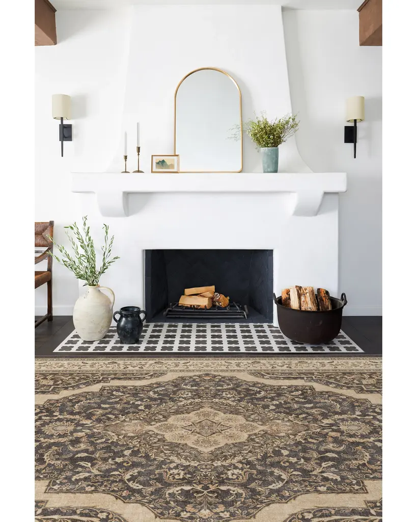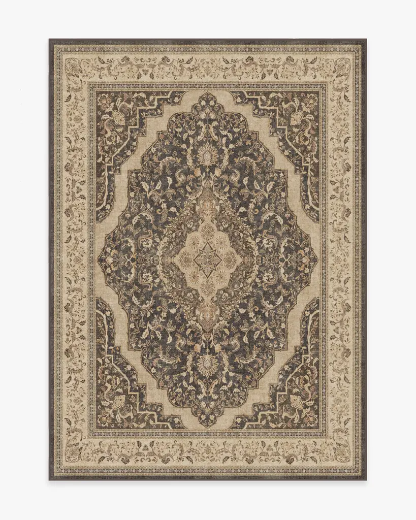 Elaborate elegance. Our Adeline Dark Wood Rug boasts a subtly distressed medallion design inspired by antique European rug patterns. It's decorated in botanical details in rustic shades of brown and black contrasted with regal pops of gold, coral, beige, and taupe, surrounded by an equally intricate vine border. Water-resistant, stain-resistant, and machine-washable.