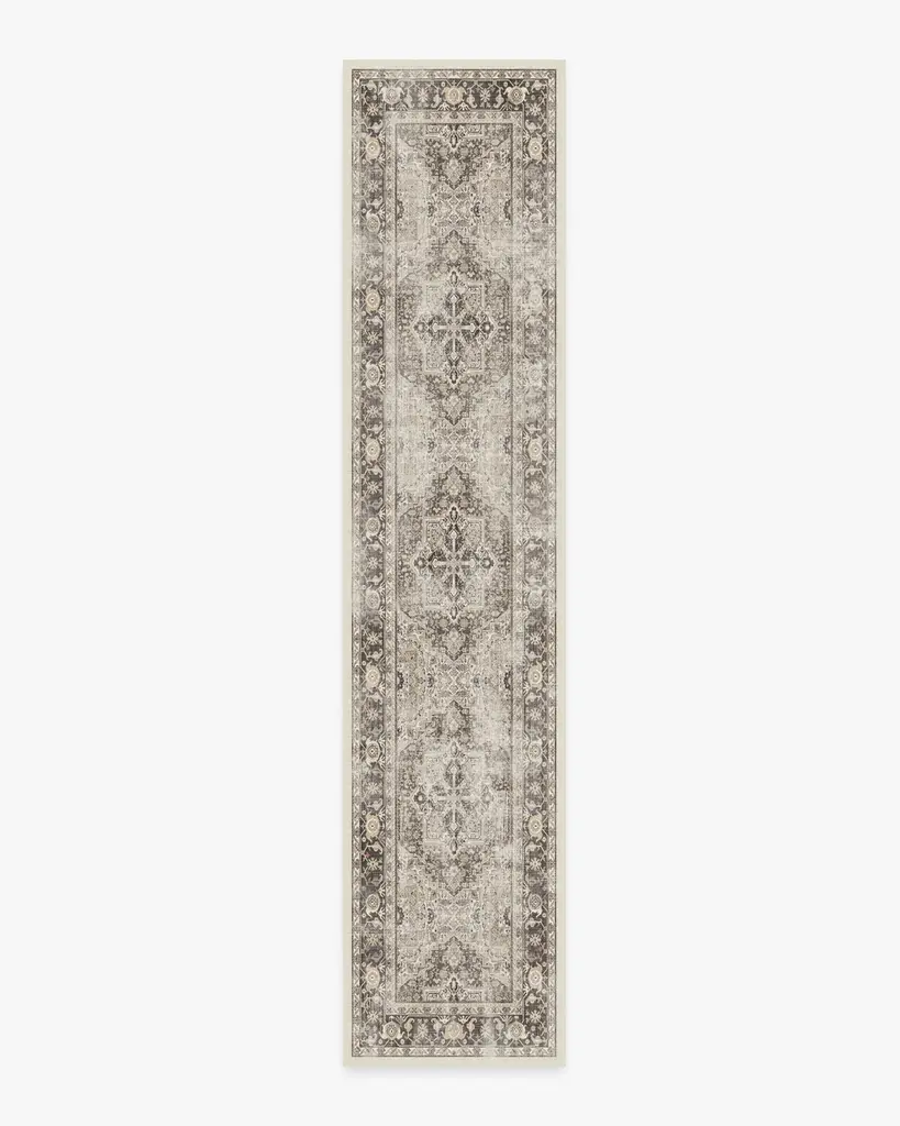 Inspired by classic European rug patterns, our Adeline Ivory Opal Rug features a gently distressed diamond medallion with ornate corners and borders in warm dark brown and tan and highlighted with bright pops of blue, dark teal, and golden yellow. Water-resistant, stain-resistant, and machine-washable.