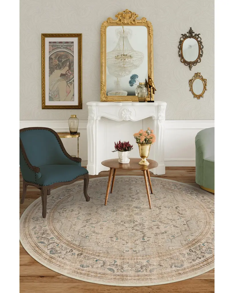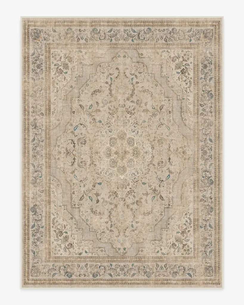 Inspired by classic European rug patterns, our Adeline Ivory Opal Rug features a gently distressed diamond medallion with ornate corners and borders in warm dark brown and tan and highlighted with bright pops of blue, dark teal, and golden yellow.